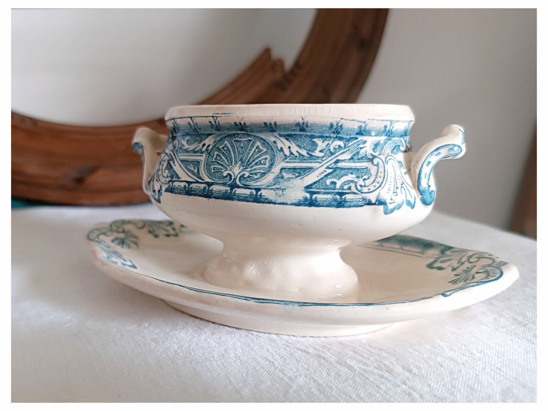 Rare et délicat petit moutardier en faïence terre de fer de la manufacture française de Creil et Montereau modèle Henri II .