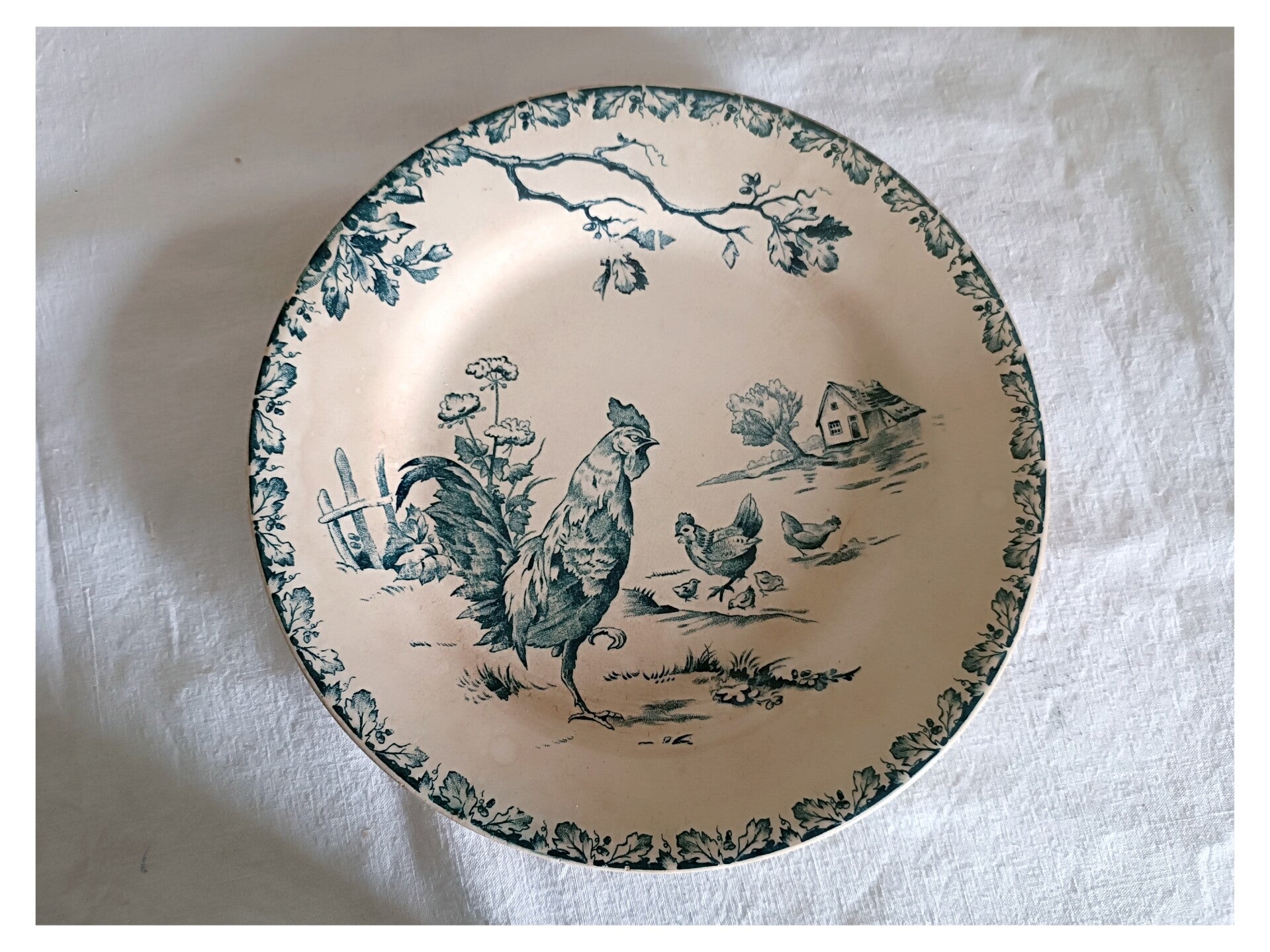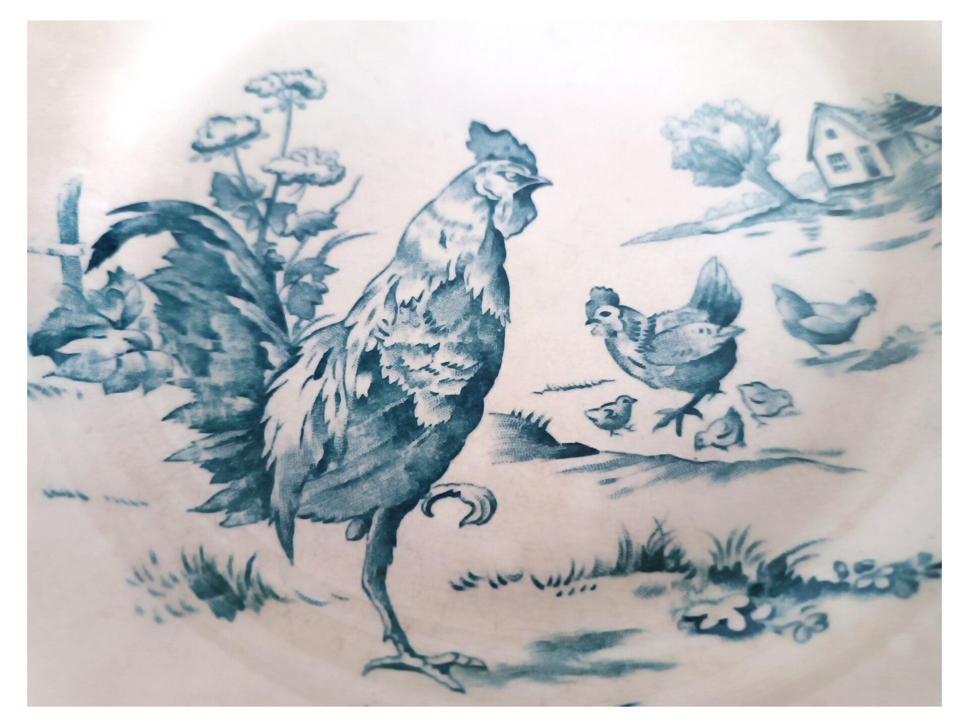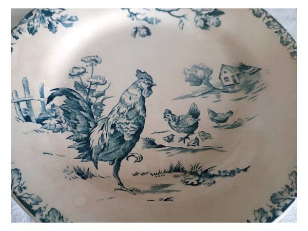 Cette assiette à elle seule est une illustration. Une scène champêtre à la basse cour présentant coq , poules et ses petits poussins . Chaque détail est travaillé avec une grand précision .