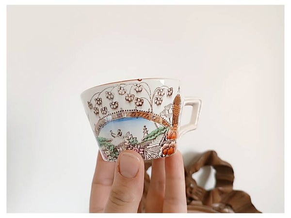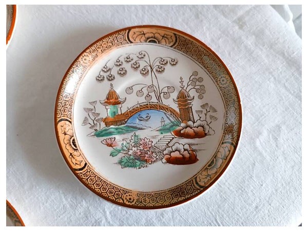 Set de six tasses et soucoupes à café en demie porcelaine de la manufacture française de Badonviller. Le modèle Tokyo, est une merveille de détails dans le goût des chinoiseries du début XXème siècle. Somptueux paysage de jardin avec ses pagodes et ses arbres à plumeaux. L'ensemble est en décor polychrome d'un rare élégance.