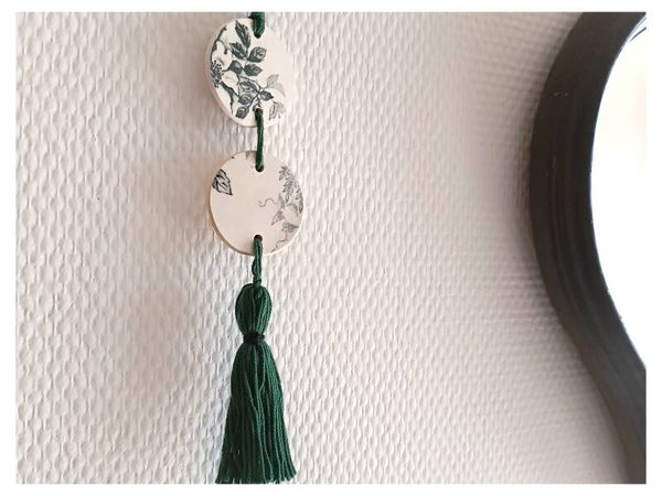 Chaque médaillon dispose d'un magnifique décor floral noir . L'ensemble est monté sur des fils et pompon en coton bio vert forêt .