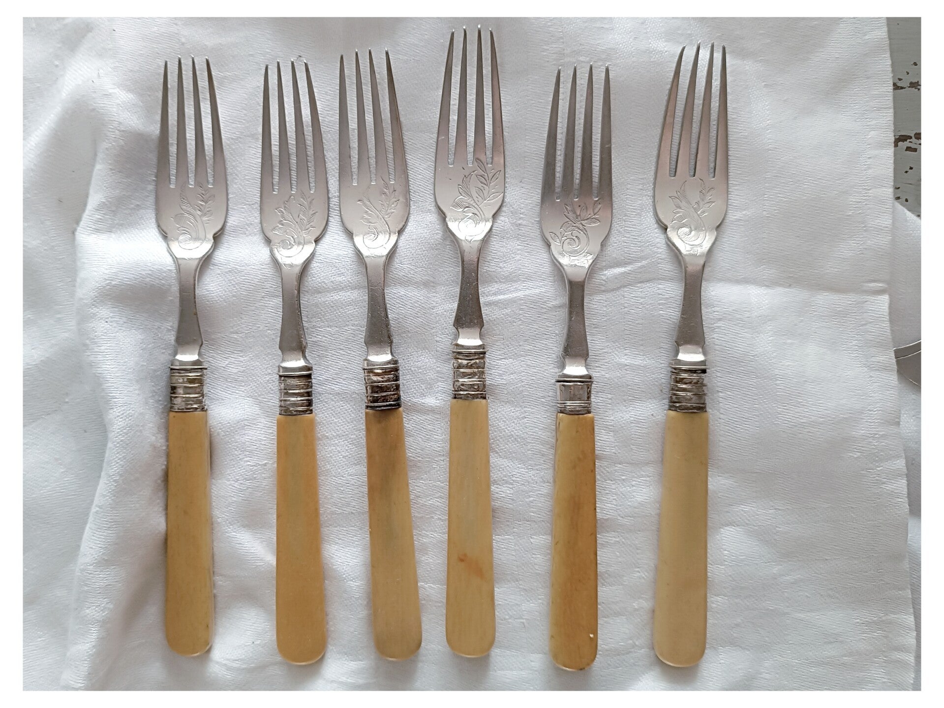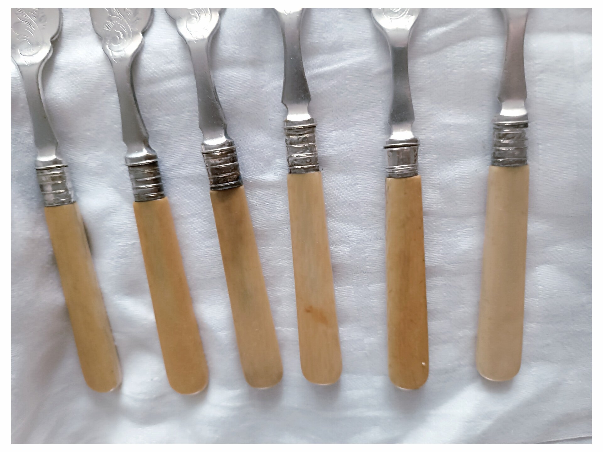 Les manches sont écrus en ivoire. Ils ont subit quelques dommages du temps ( fissures et traces ) qui n'altèrent pas leur usage .