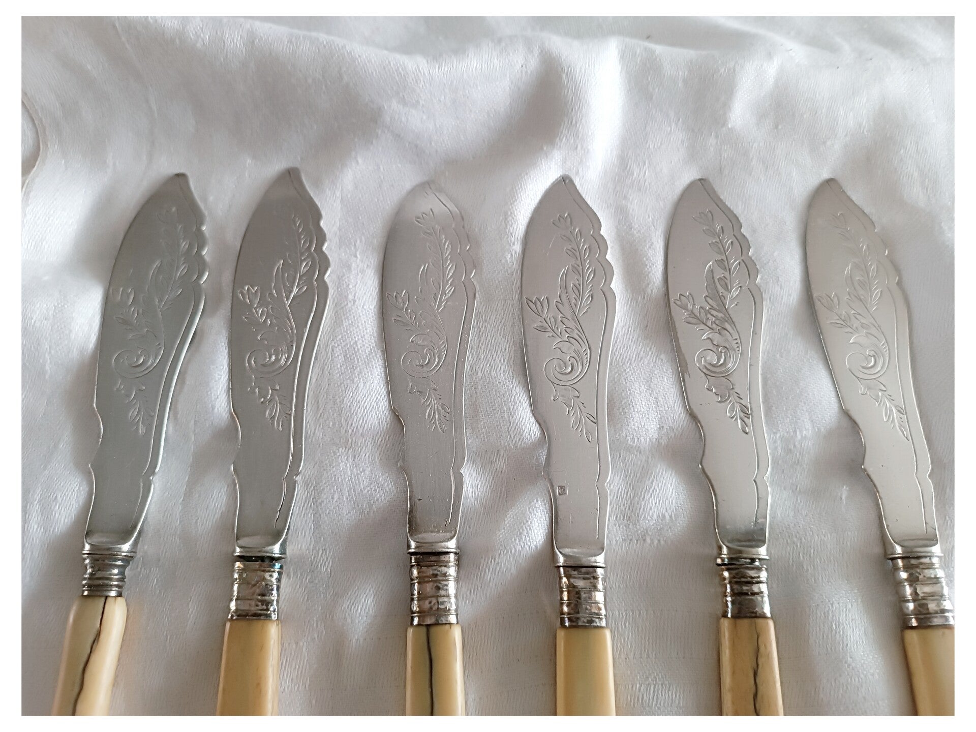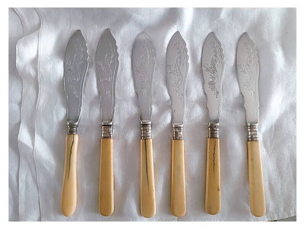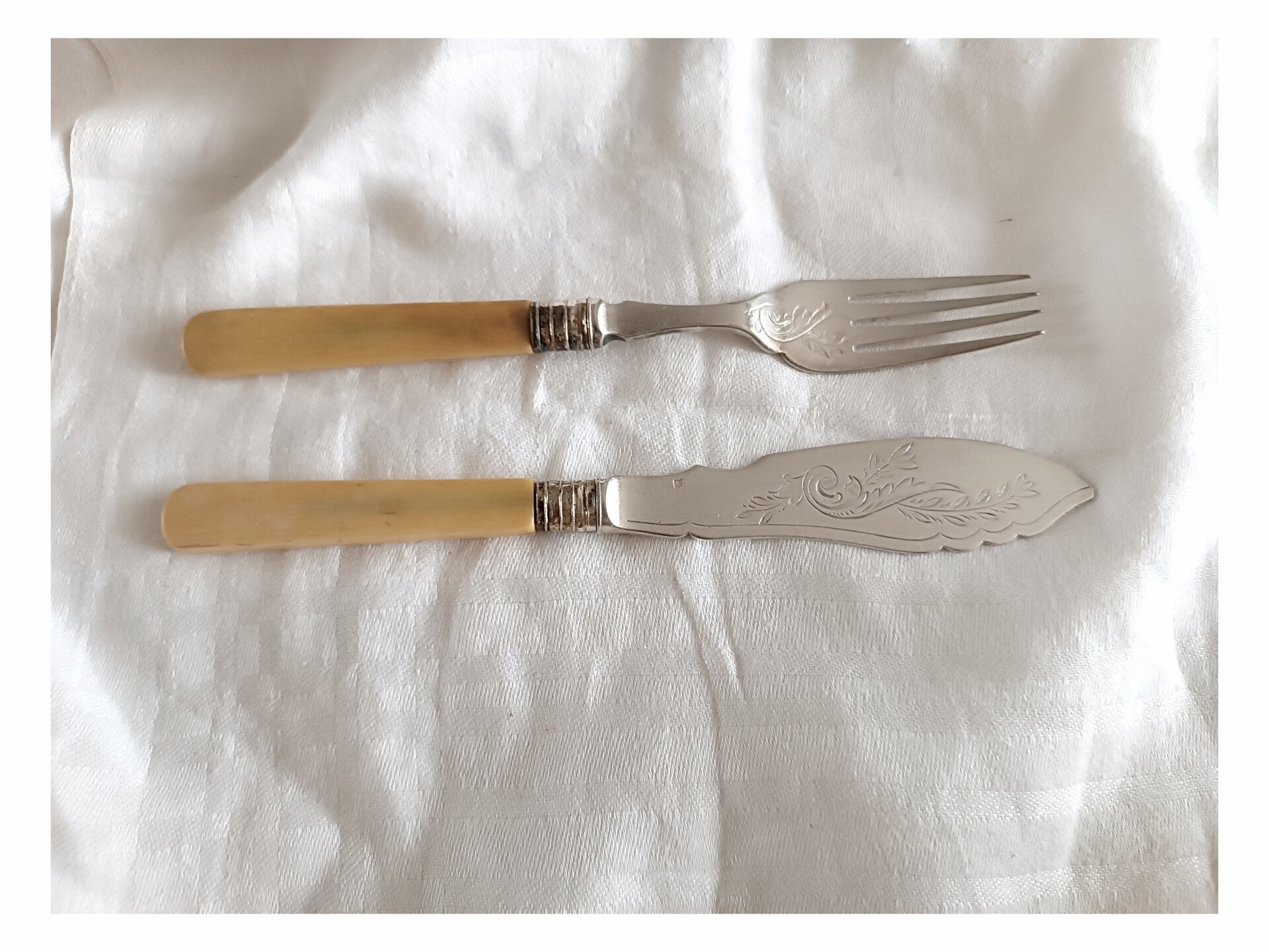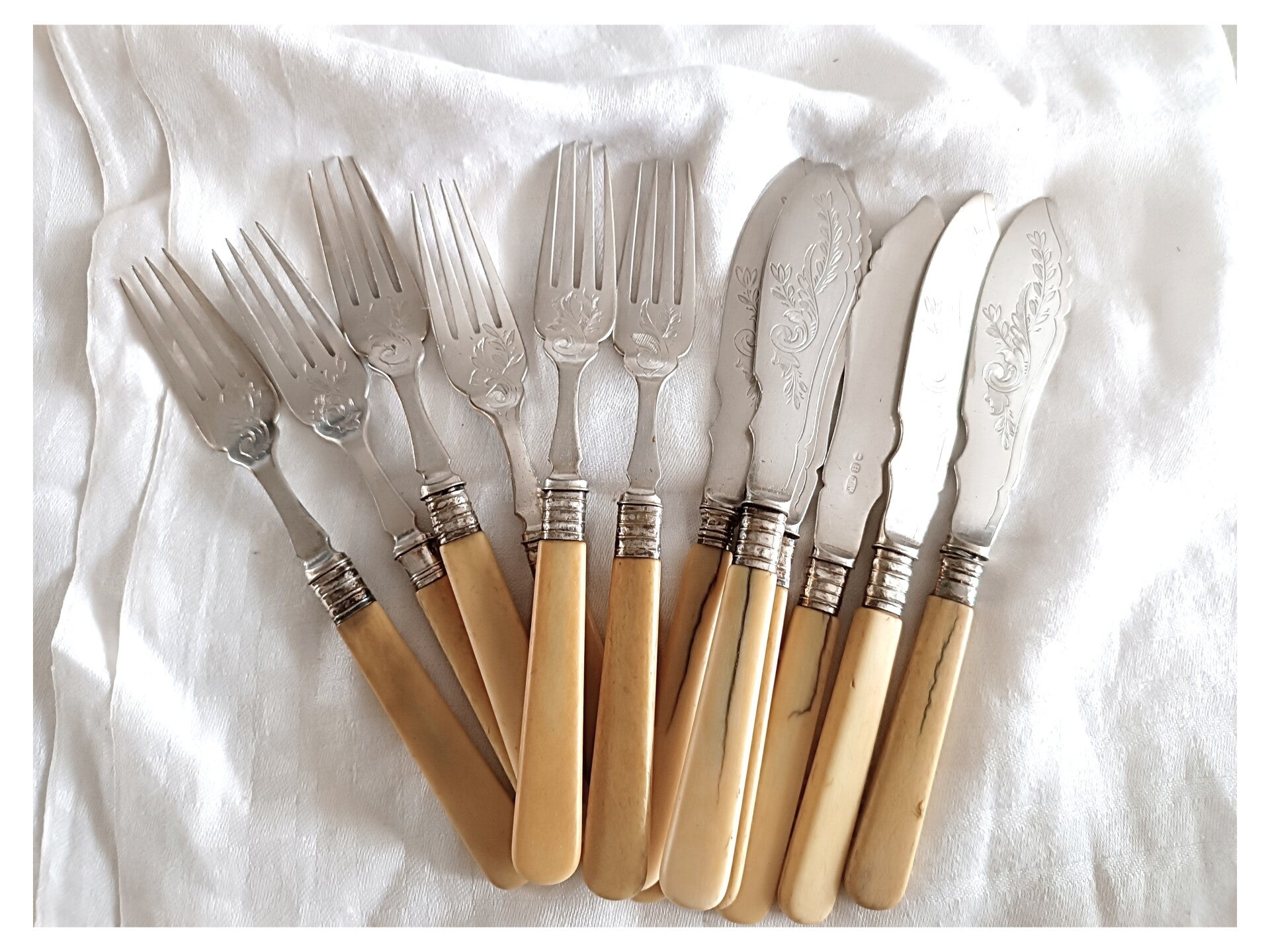 12 couverts à poisson en argent gravé et os , fourchettes et couteaux art nouveau 1900
