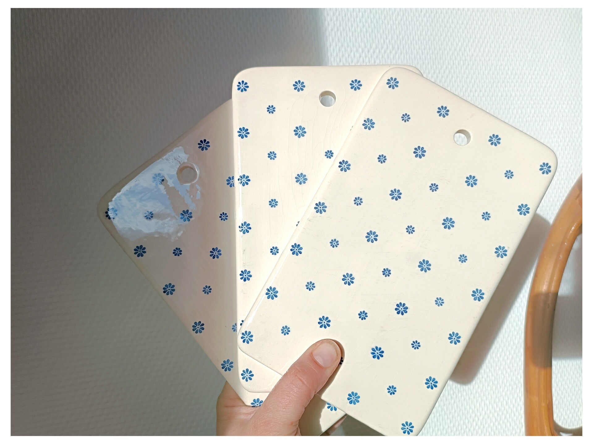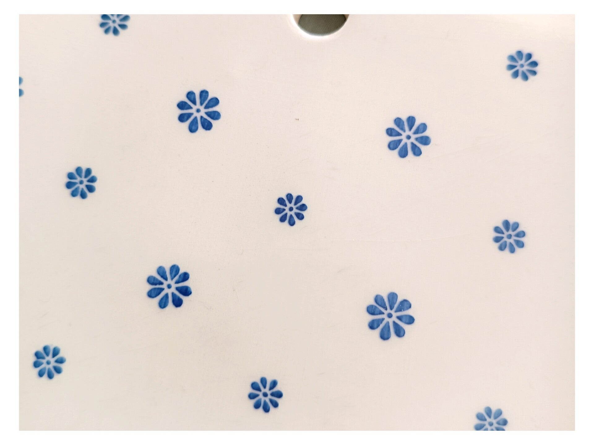 Petite planche à tartiner en faïence ivoire avec un décor de petites fleurs bleues .