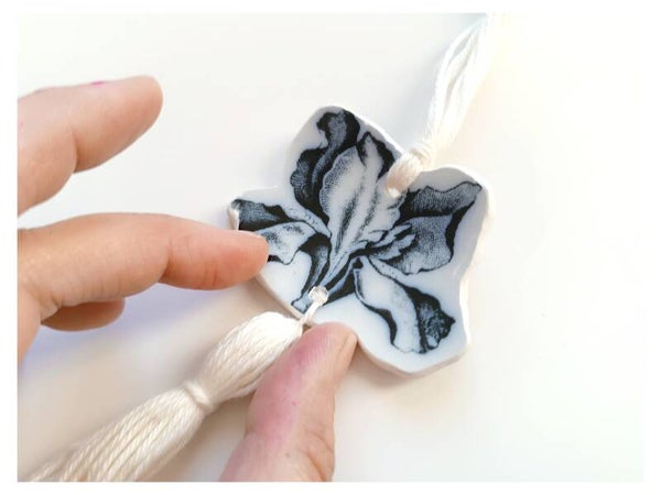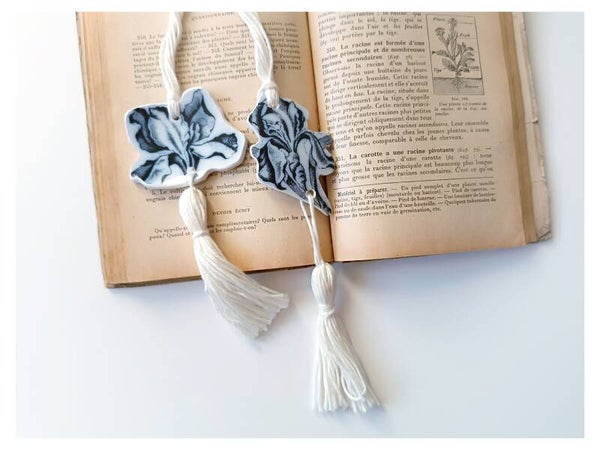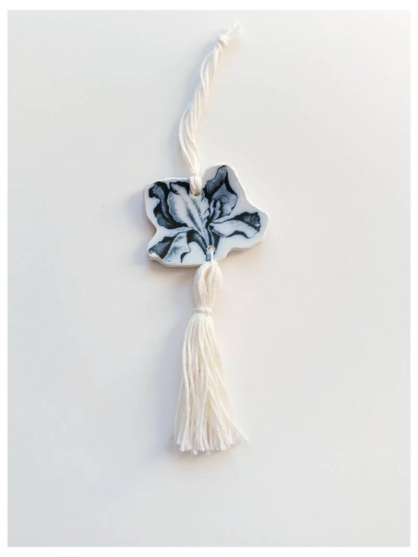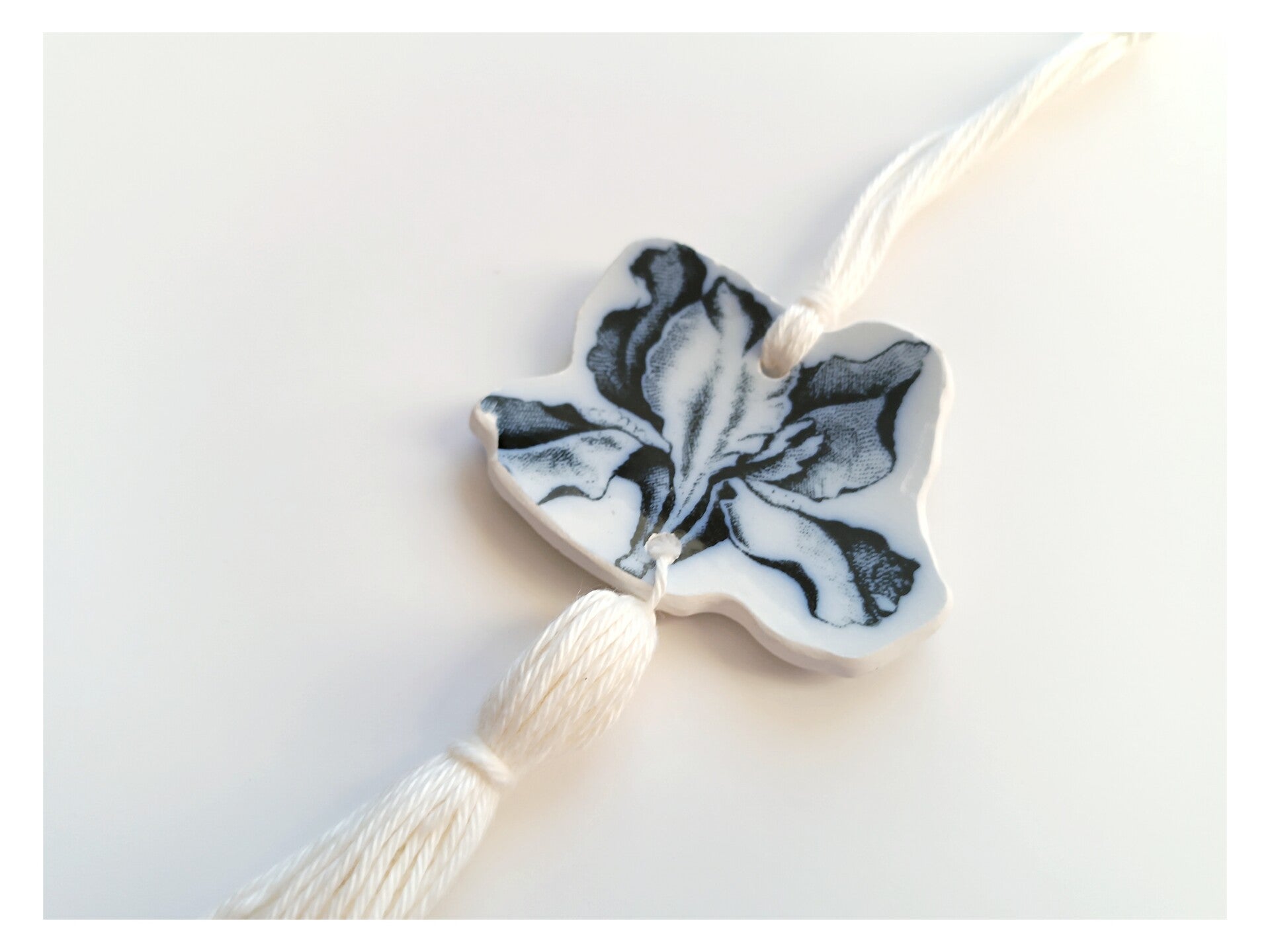 Grande fleur d'iris d'un bleu profond ciselé dans un compotier ancien en faïence terre de fer de la manufacture française de Badonviller.