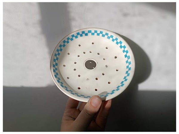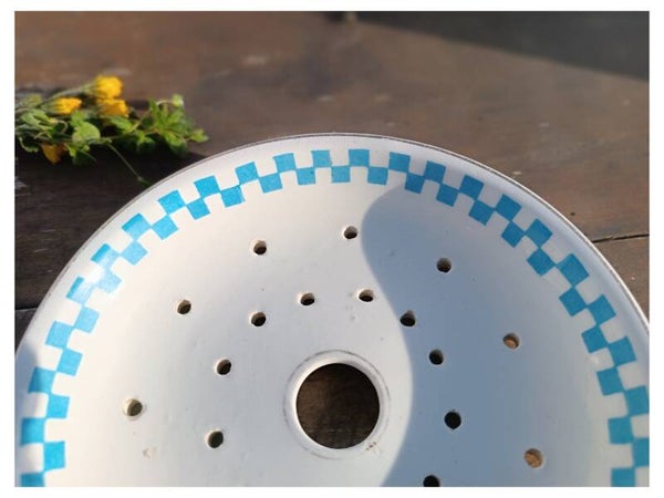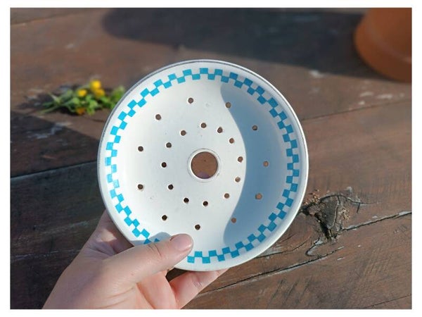 Ancien plat percé ancien en faïence pouvant servir en porte-savon à la salle de bain ou pour égoutter quelques fruits à la cuisine .
