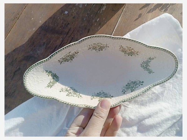 Superbe modèle avec un décor raffiné de fleurs vert olive . Effets de reliefs sur les bordures très délicats .