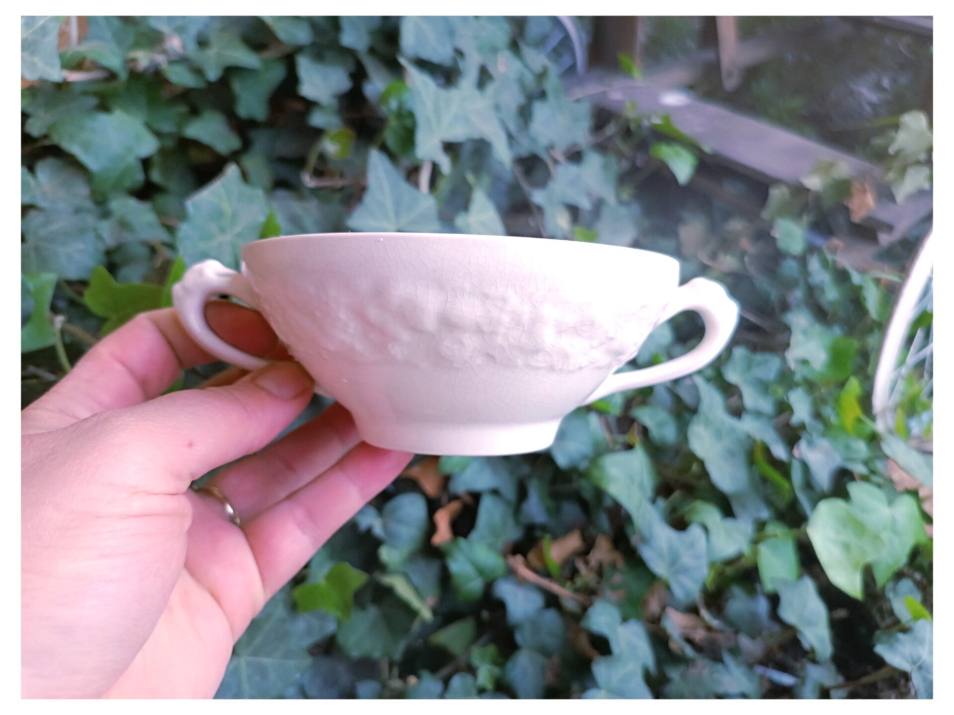 Chaque tasses est munie de deux anses et d'un décor de fruits et fleurs en relief.