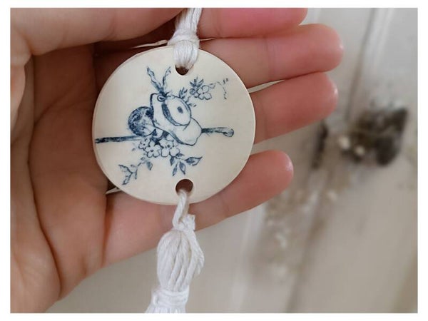 Décoration à suspendre réalisée à partir d'une assiette ancienne upcyclée en faïence terre de fer de la manufacture française de Gien modèle Attributs .