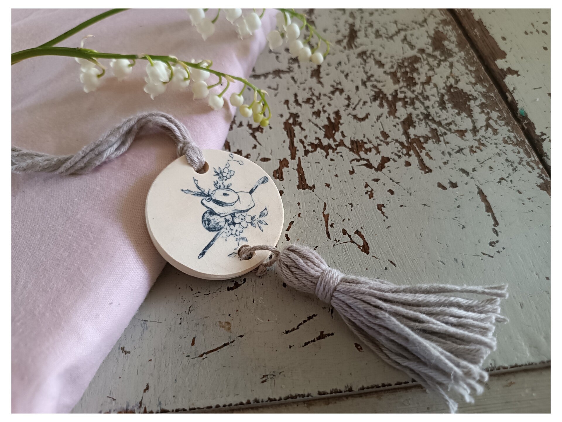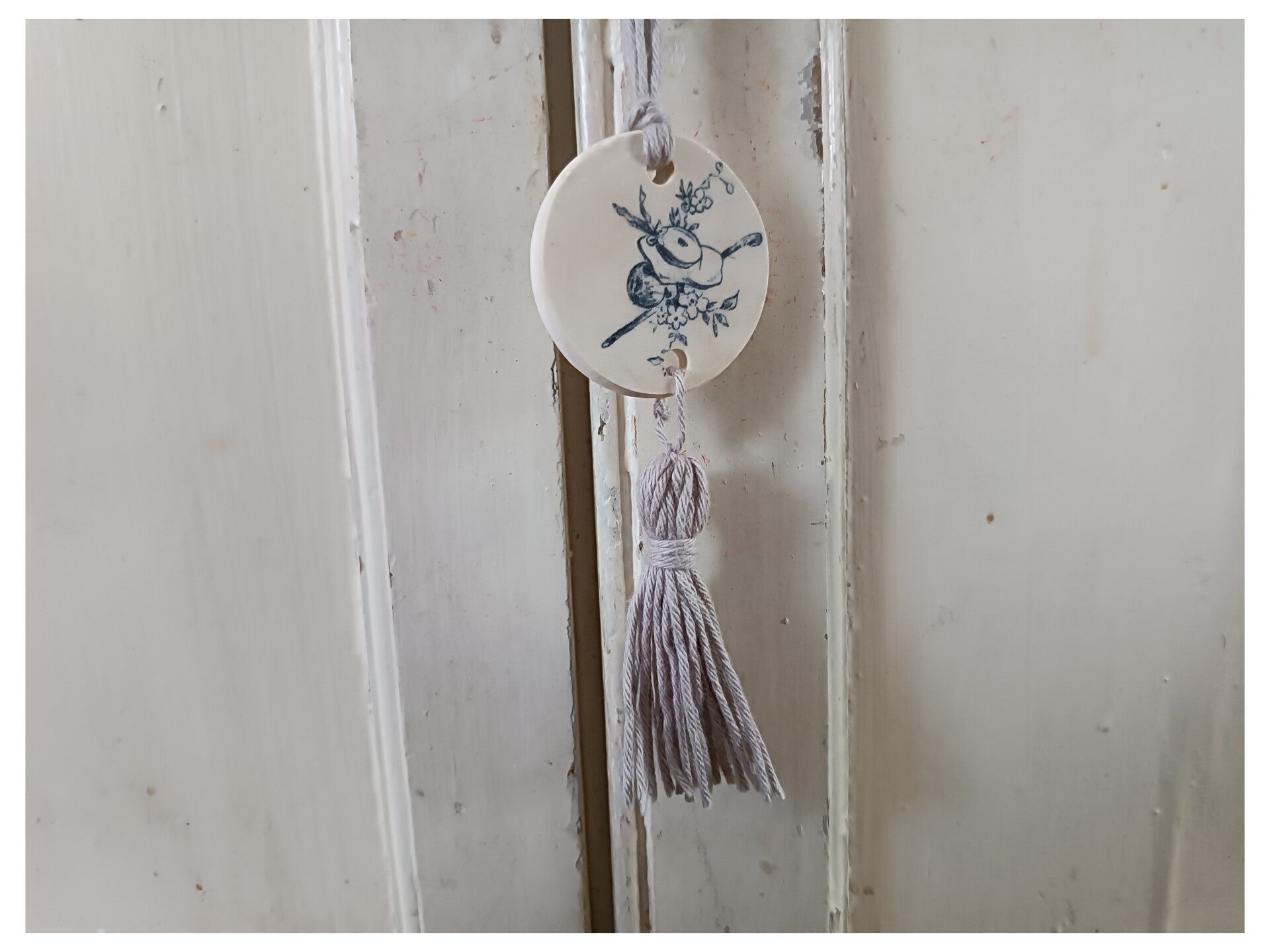 Suspension médaillon pompon Attributs, Gien terre de fer recyclée