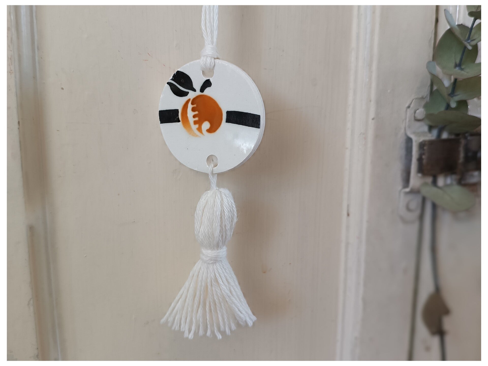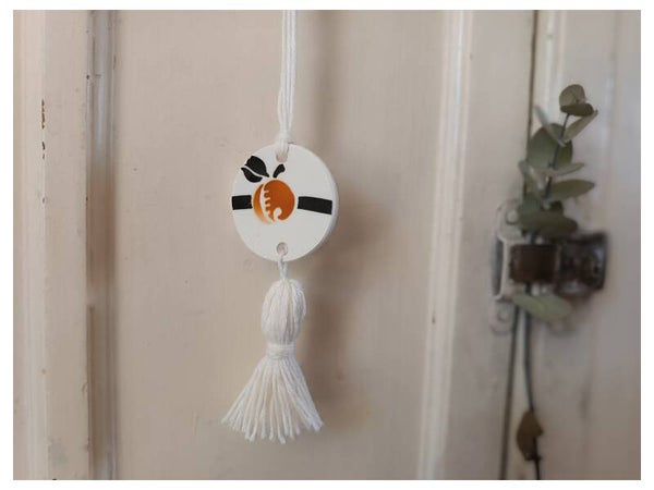 Suspension médaillon pompon, abricot , faïence de Badonviller recyclée , orange et noir