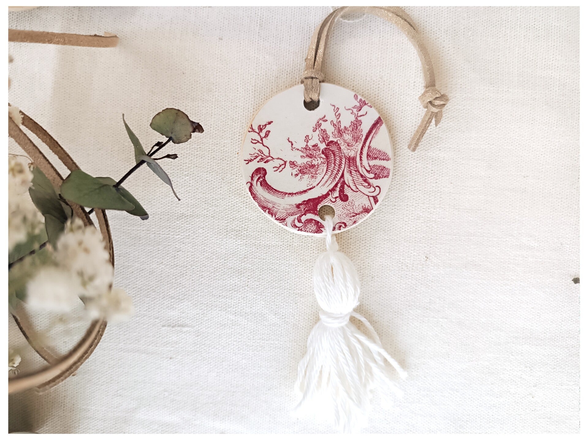 À suspendre à la clé d'un meuble , une poignée de porte ou encore une penderie . Les bordures peuvent être parfumées .