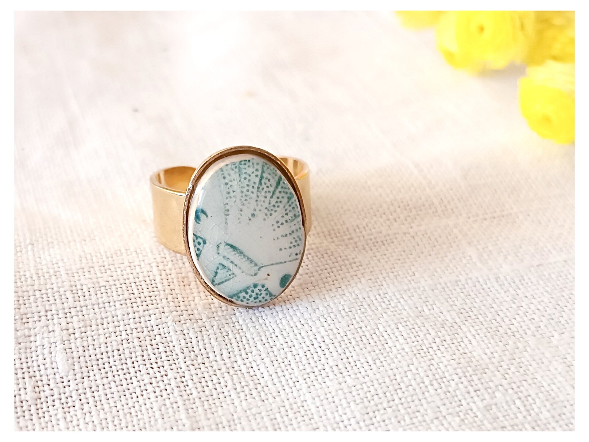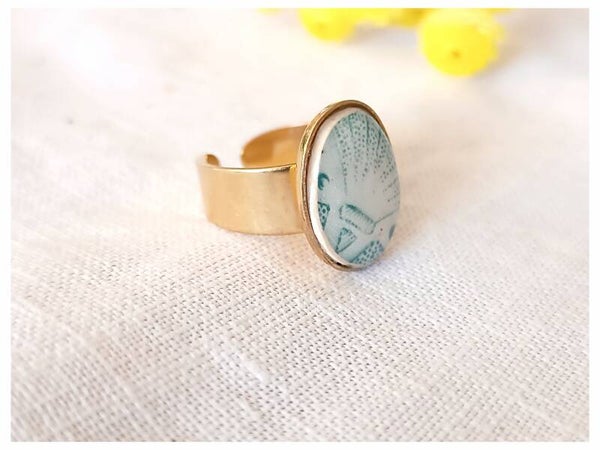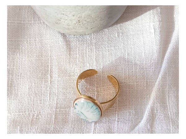 Bague Artemis , faïence de Longchamp verte , dorée à l'or fin