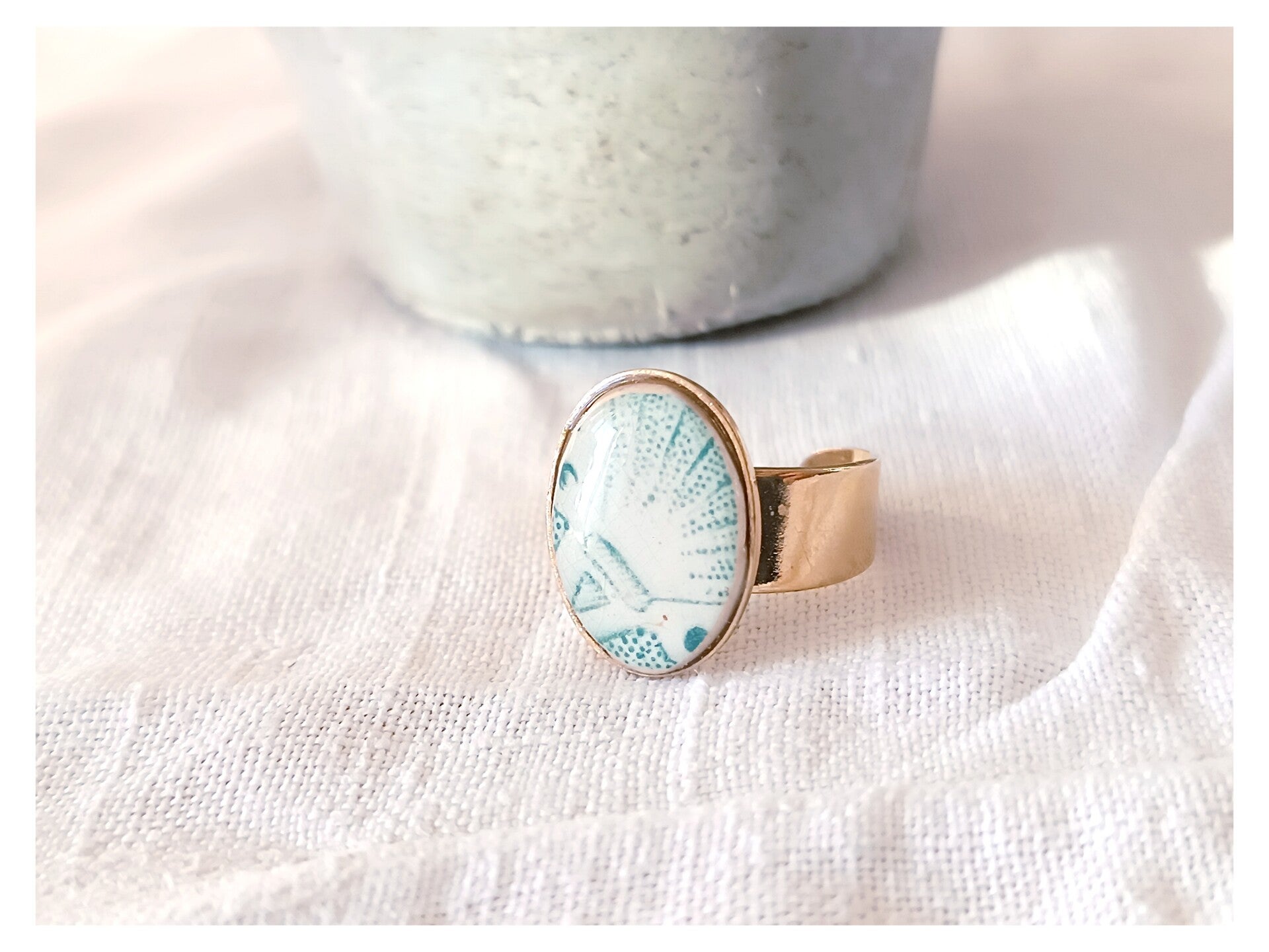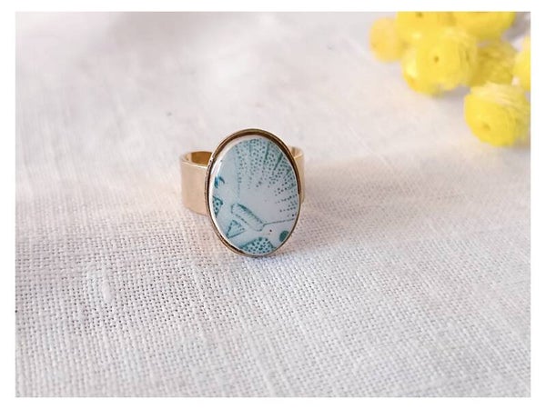 Bague réalisée à partir d'un fragment d'assiette de la manufacture française de Longchamp modèle Héléna ( vers 1910).