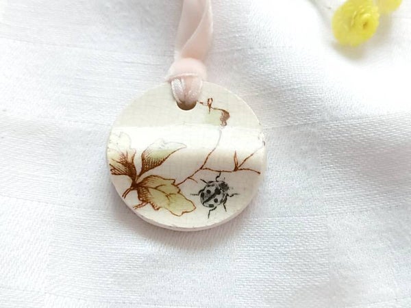 Médaillon réalisé à partir d'une assiette ancienne en faïence terre de fer anglaise .