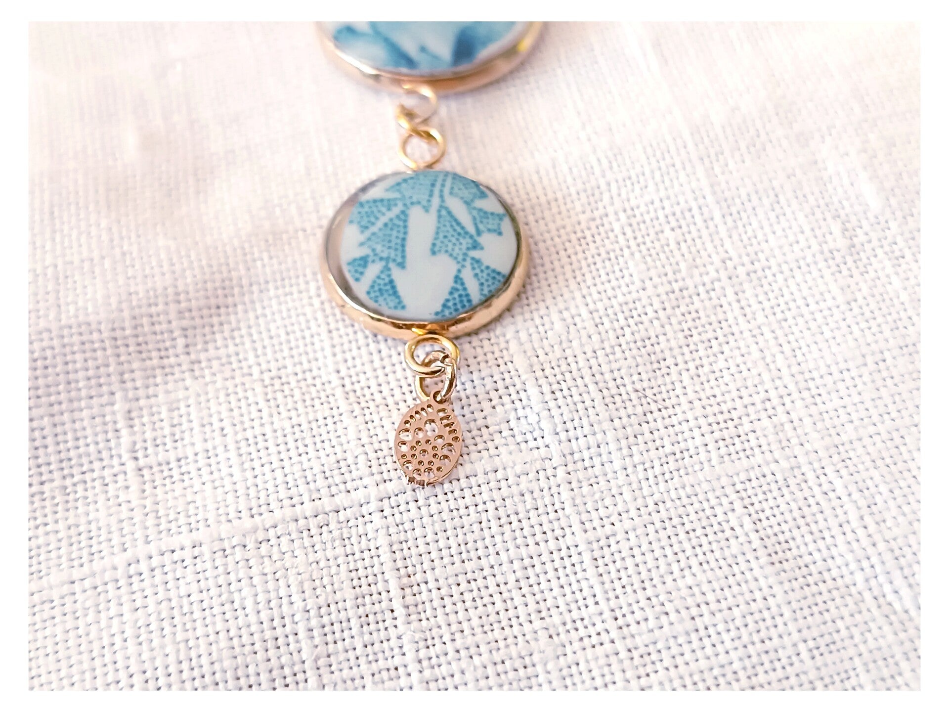 Chaque médaillon dispose d'un décor appartenant à la même assiette . Subtil décor de feuillage et fleur bleu profond .