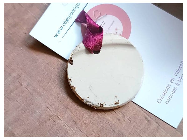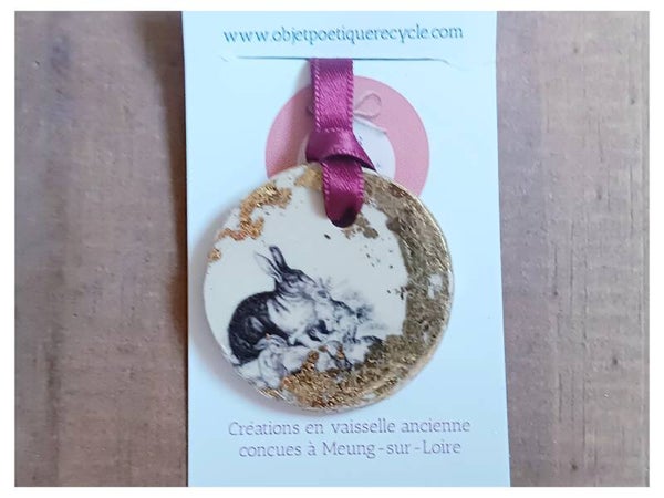 Médaillon en faïence blanche blanche ornée d'une adorable lapine et de ses petits . Dorure à la Feuille.