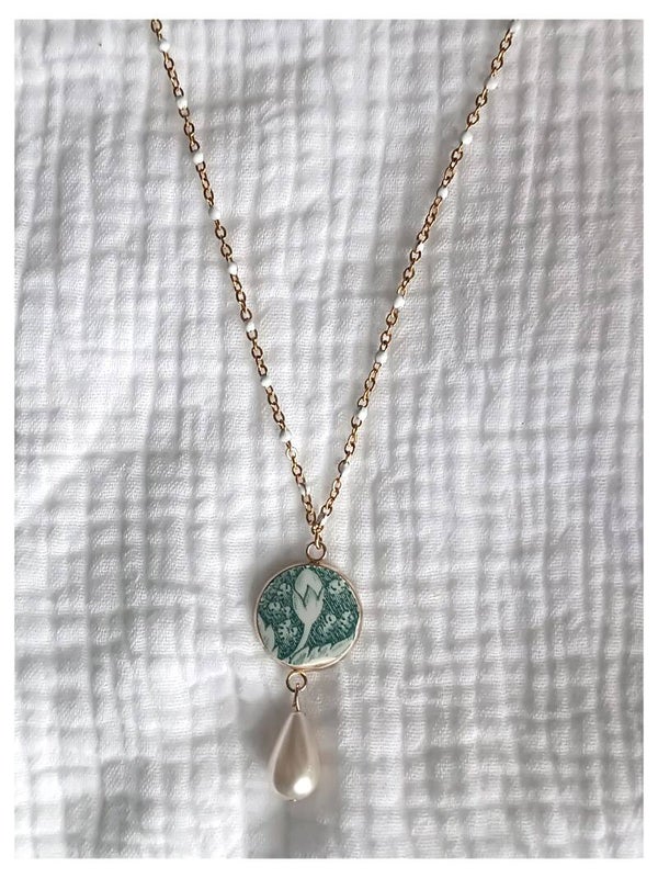 Collier Carla , chaînette perlée blanche et or , faïence Pexonne verte
