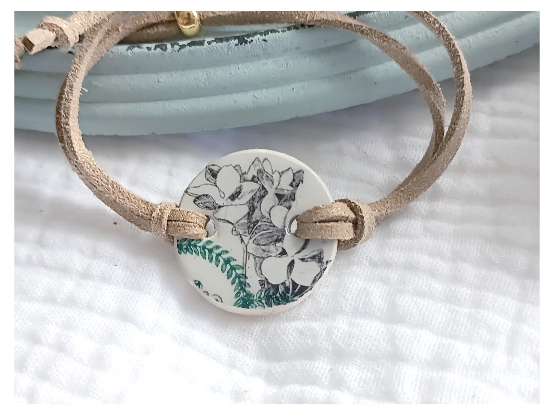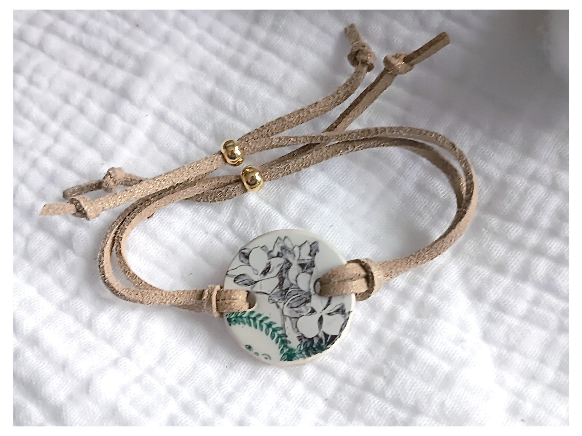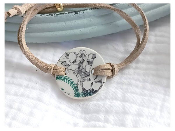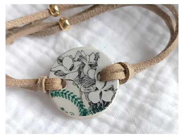Bracelet Clotilde , faïence Saint Amand Hamage vert sérigraphié fleurs noires .