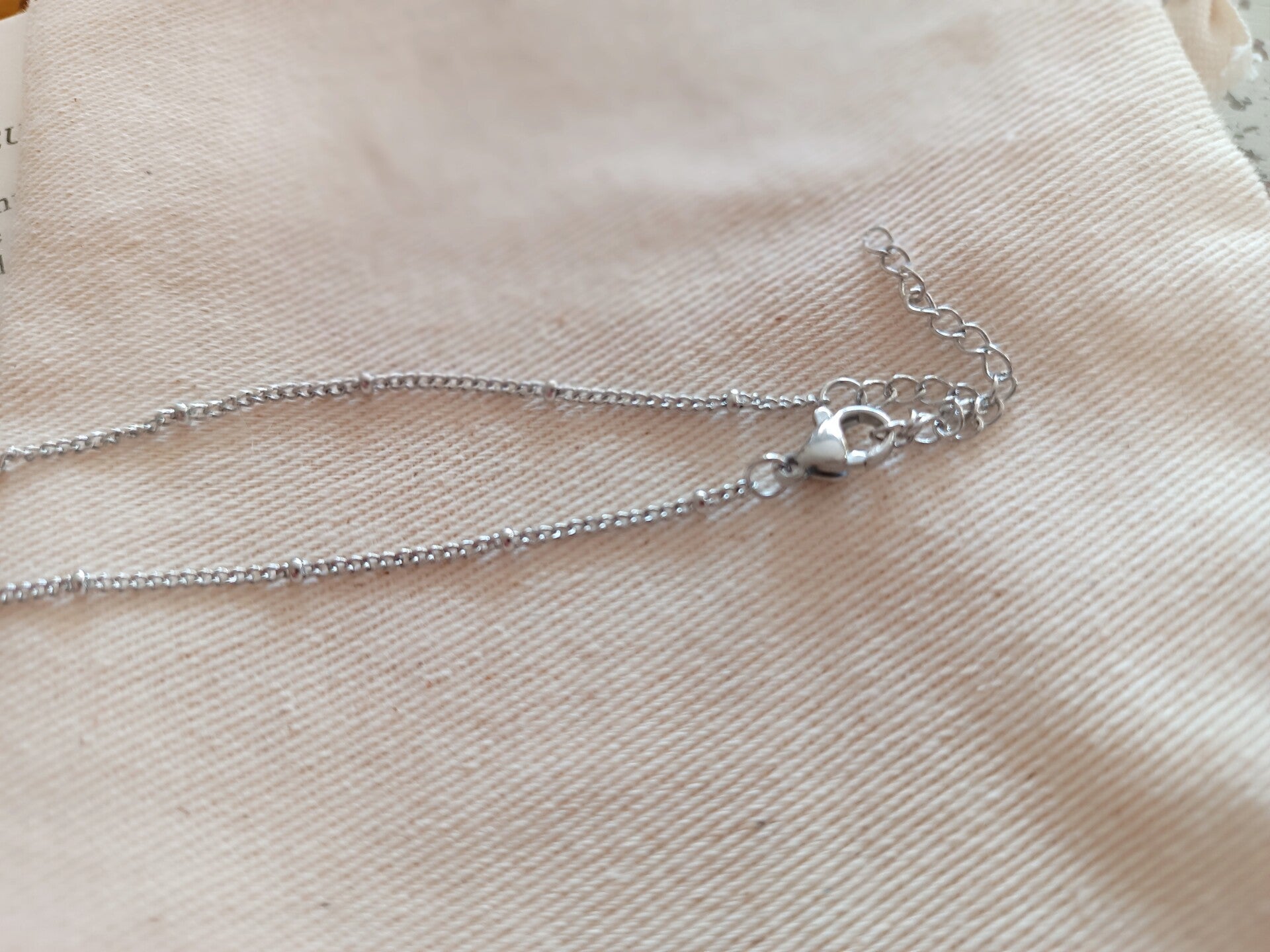 Monté sur une chaine boule en acier inoxydable argenté, le pendentif du modèle Hyacinthe a été restauré par nos soins pour recevoir un delicat médaillon ovale en faïence de Gien.