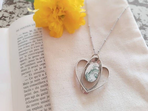 Collier Hyacinthe, pendentif ancien cœur argent , faïence terre de fer Gien vert recyclée