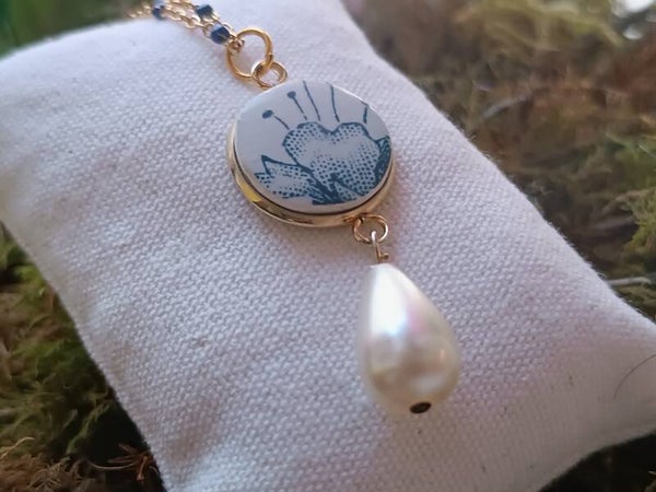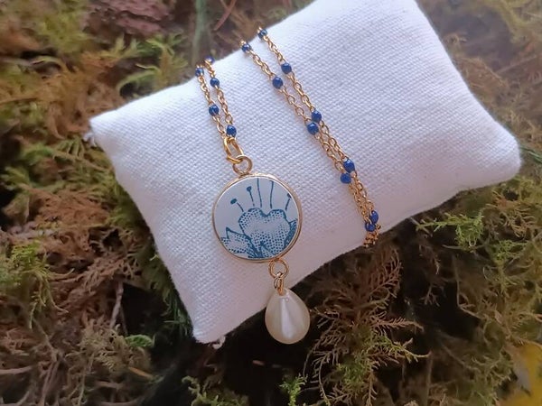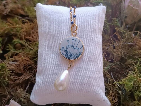 Collier Ombeline, faïence de Gien Royat bleu recyclé, chaîne perlée bleu marine et perle goutte