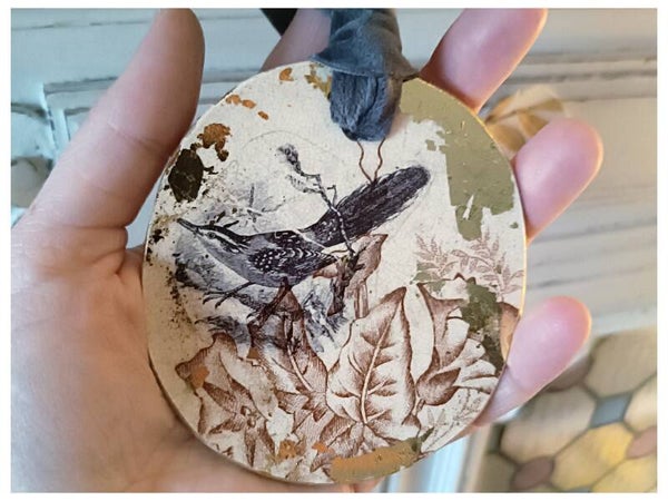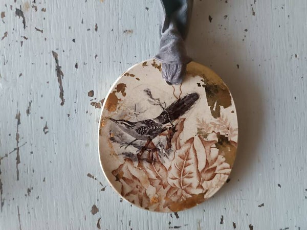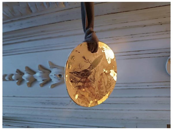Ce médaillon ovale arbore une delicat décor de feuilles et fleurs accompagné d'une oiseau noir.