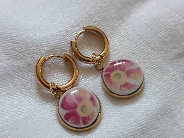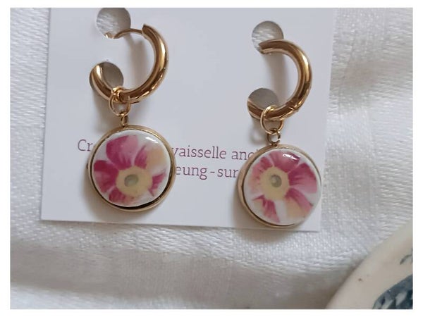 Une jolie paire de créoles au format mini ( 15mm de diamètre) orné de deux fleurs colorées en porcelaine de Limoges.