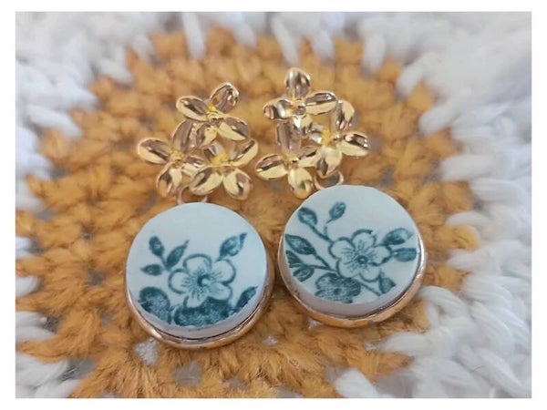 Boucles d'oreilles fleuries , Madeleine, faïence de Longwy " Mai" , fleurs bleues, vaisselle recyclée