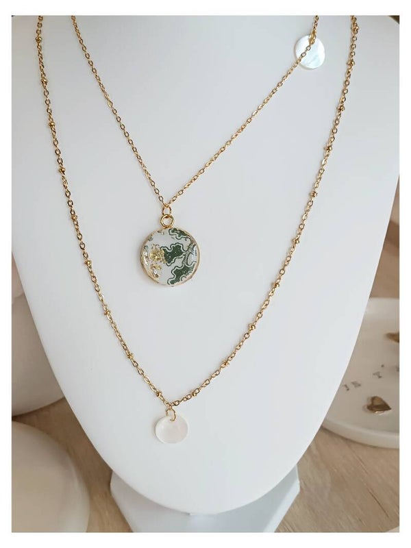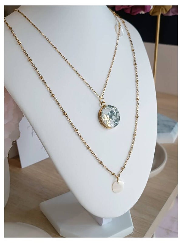 Élegance aux notes art nouveau avec ce collier double rangs en acier inoxydable doré perlé et rehaussé de nacre.