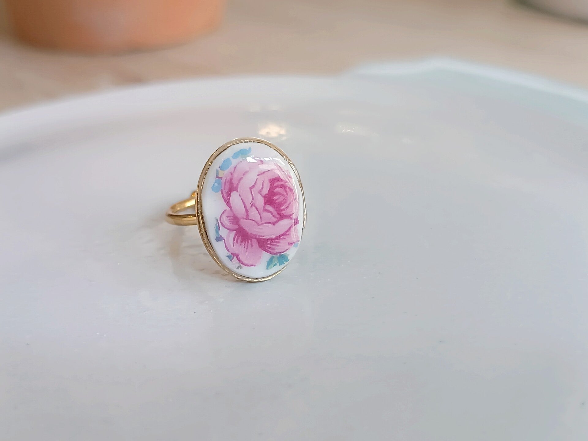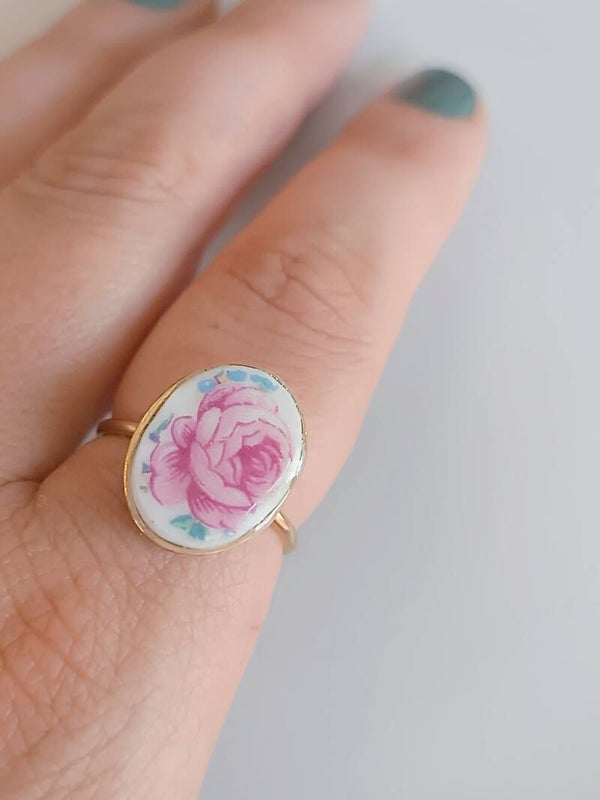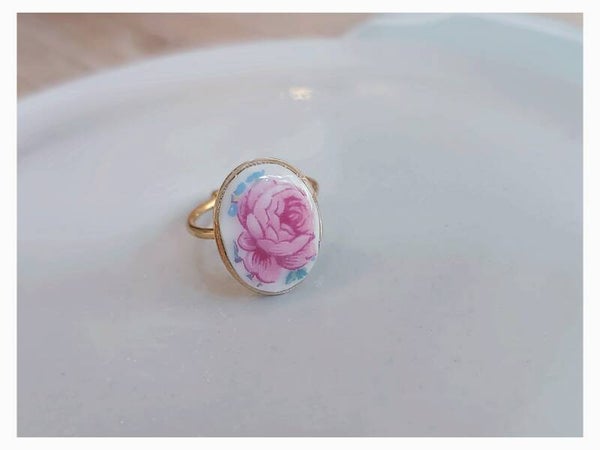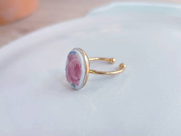 Bague Fanette , porcelaine de Limoges fleurie , fleur rose monture dorée