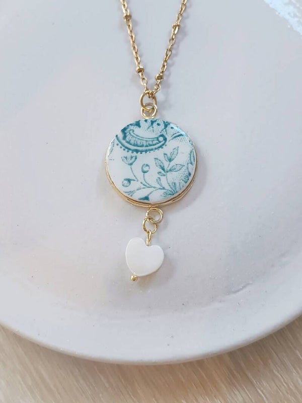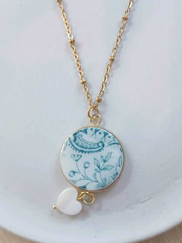 Collier Magda , Faïence de saint-Amand recyclée, terre de fer, doré cœur nacre