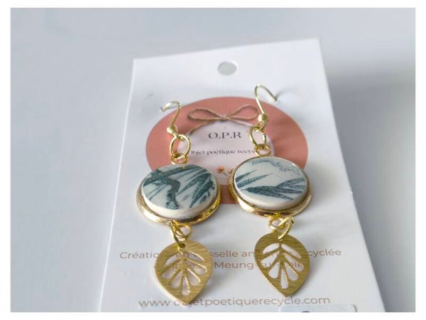 Boucles d'oreilles fleuries , Gaëlle, faïence Creil et Montereau, bambou gris, vaisselle recyclée