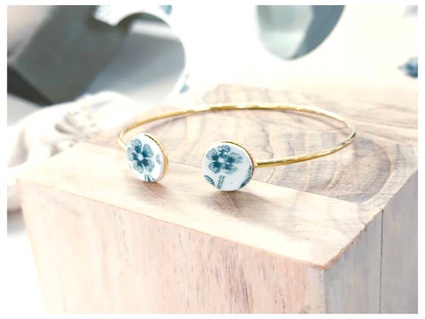 Bracelet manchette double, Lucie , faïence Sarreguemines Iena verte , laiton doré