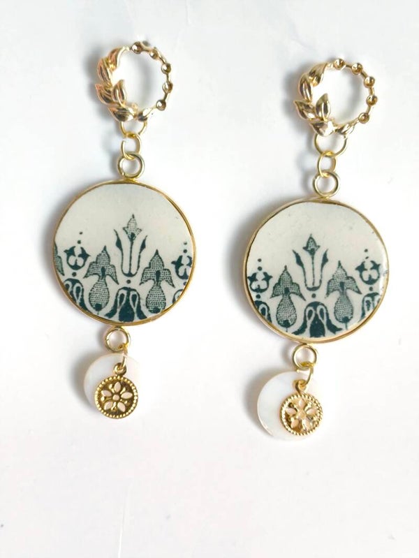 Boucles d'oreilles pendantes ,Diane , couronne dorée, faïence de Gien verte recyclée
