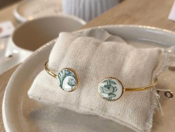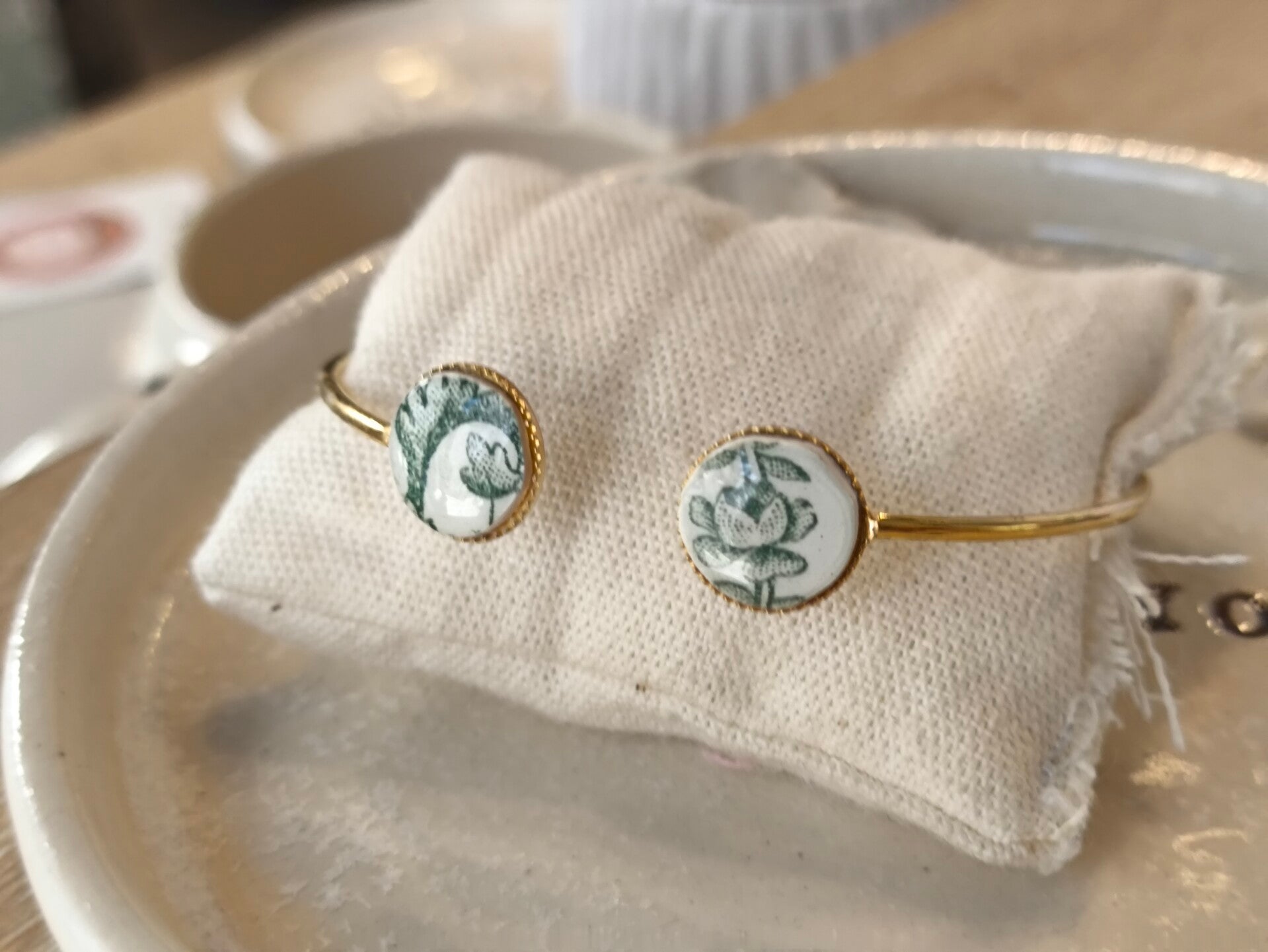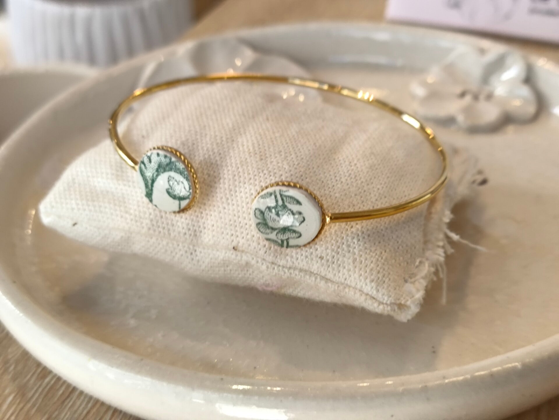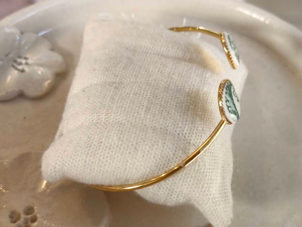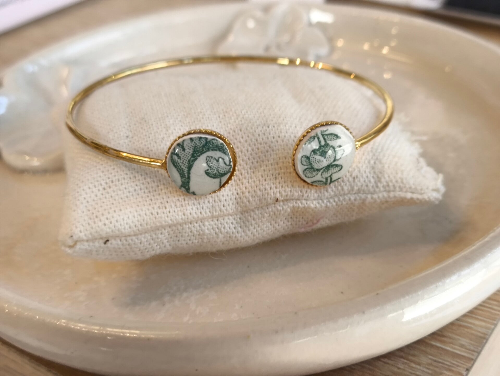 Bracelet manchette double, Marie , faïence de Gien verte , laiton doré