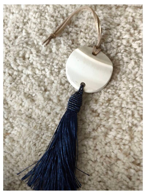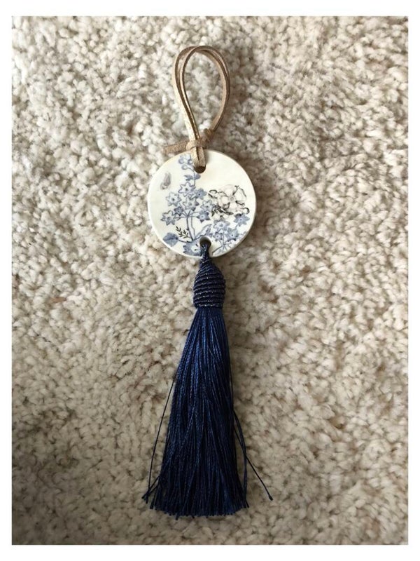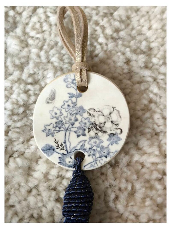 Collection Petites bêtes, pampille en faïence de Longwy bleu mai sérigraphié fleurs noires, décoration à suspendre