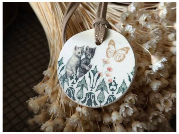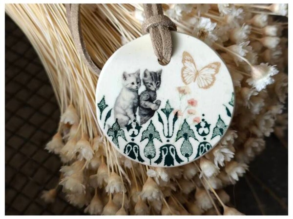 Collection Petites bêtes, médaillon en faïence Gien recyclée, chatons papillon, décoration à suspendre