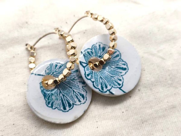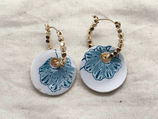 Créoles Roxanne en laiton doré – Faïence Sarreguemines recyclée – Fleurs bleues