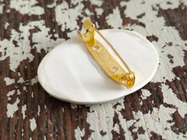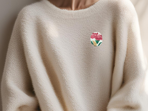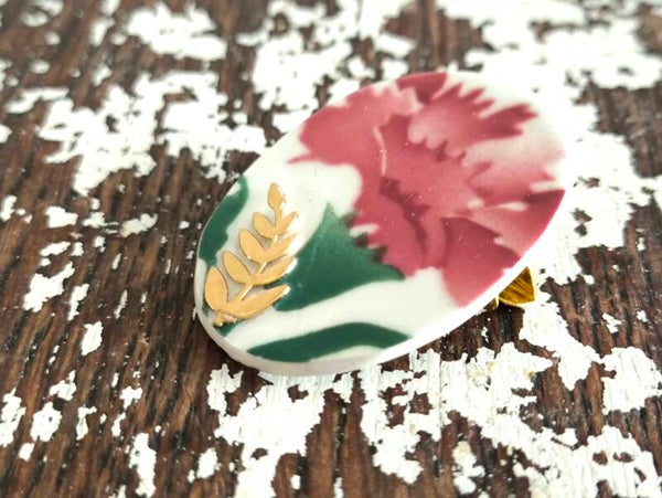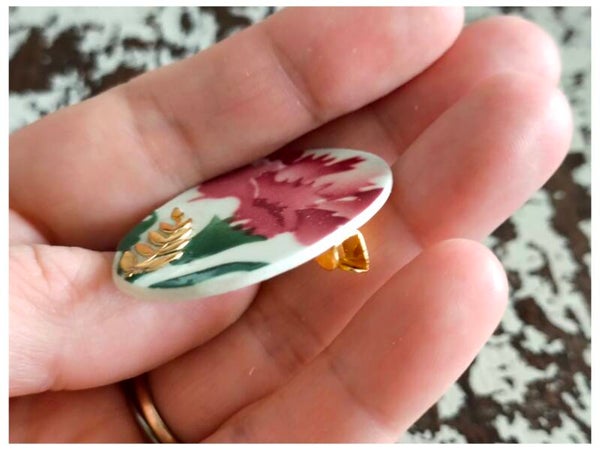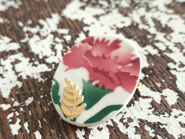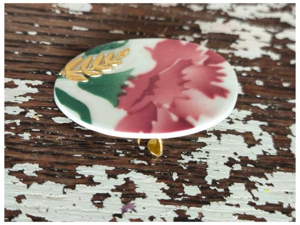 Grande broche Alma , faïence de Digoin recyclée , oeillets roses, vaisselle ancienne recyclée