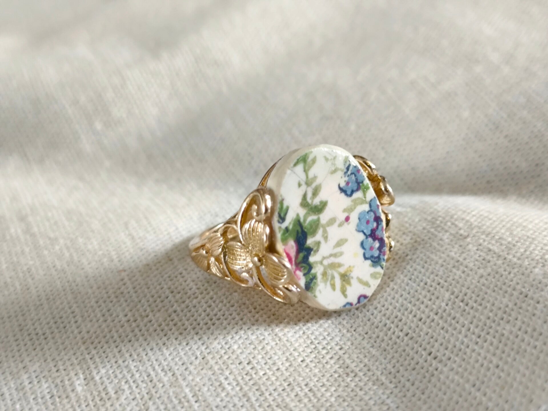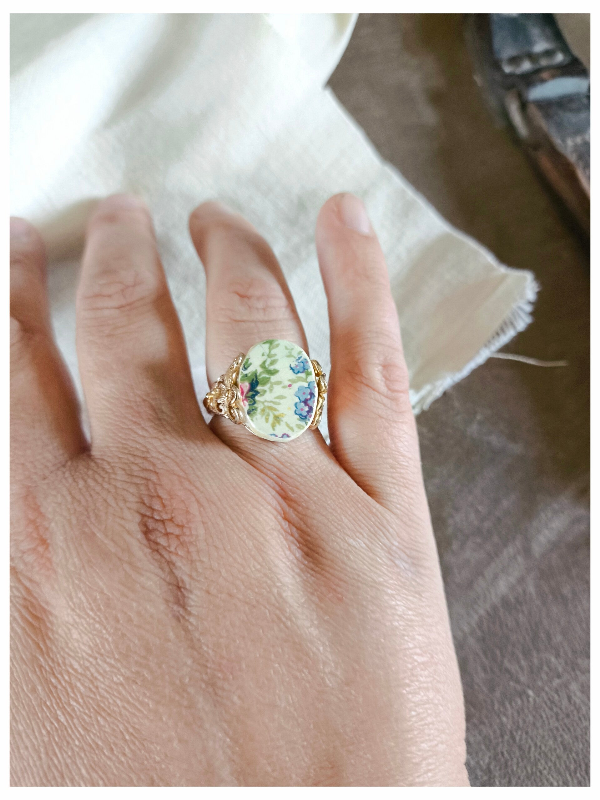 Bague Bérénice, monture acier doré fleurie ajourée, faïence de Ceranord recyclée fleurie rose