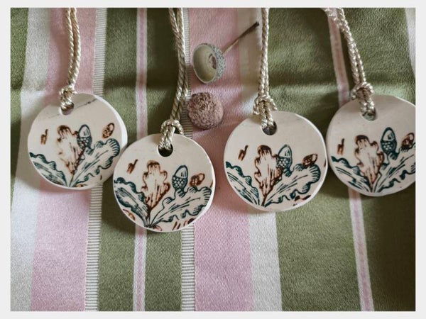 Realisées en faïence de Badonviller dans une assiette au décor de glands et feuilles de chêne.