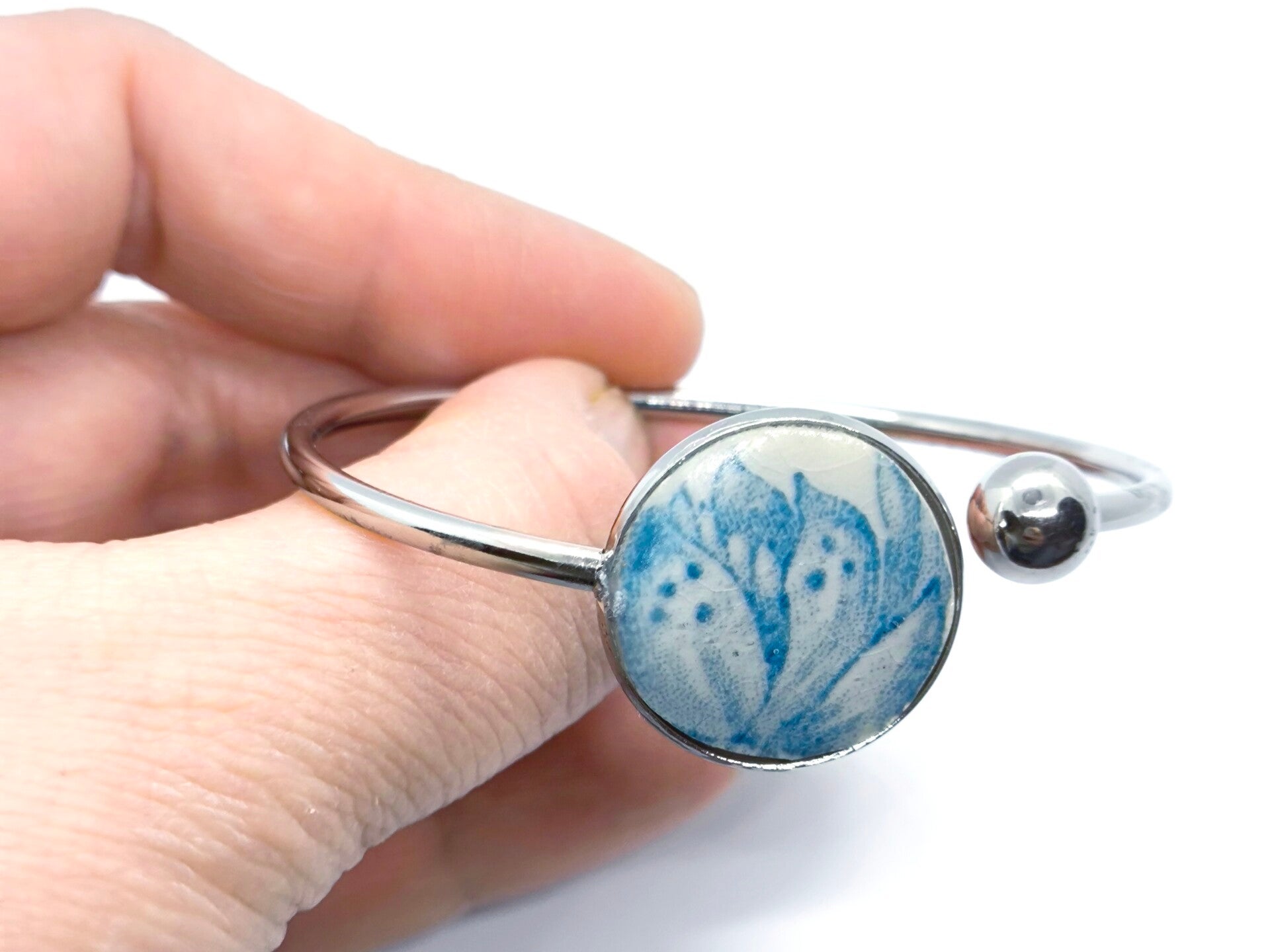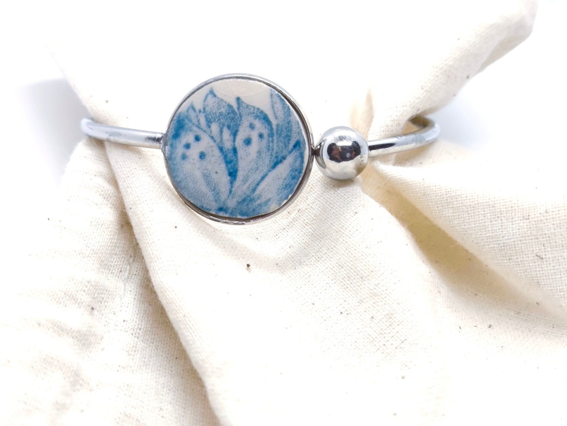 Bracelet jonc argent , Olivia , faïence Gien Royat Guirlandes recyclée, bleu