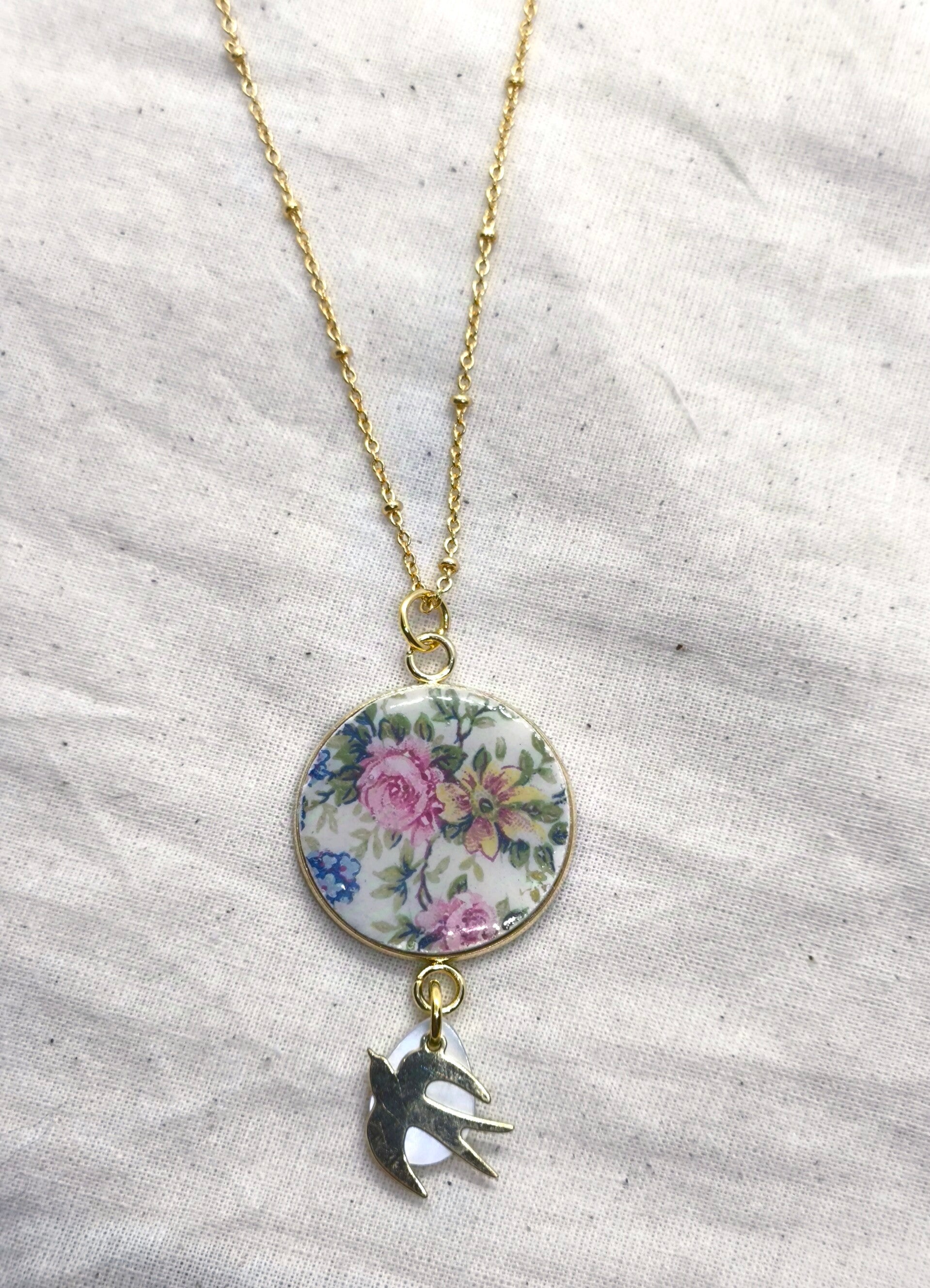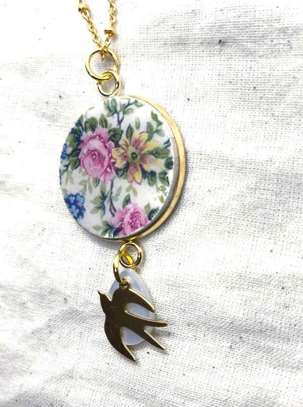 Collier Maryse , faïence anglaise Liberty recyclée, nacre et hirondelle dorée é