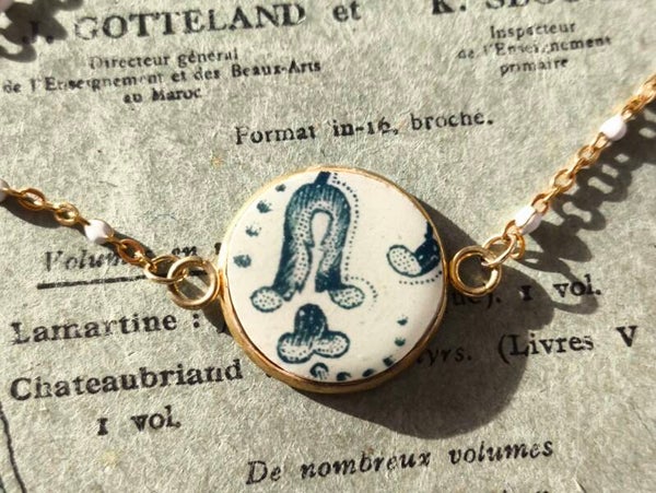 Bracelet Aline , chaînette perlée , médaillon bleu Choisy-le-Roi faïence terre de fer recyclée