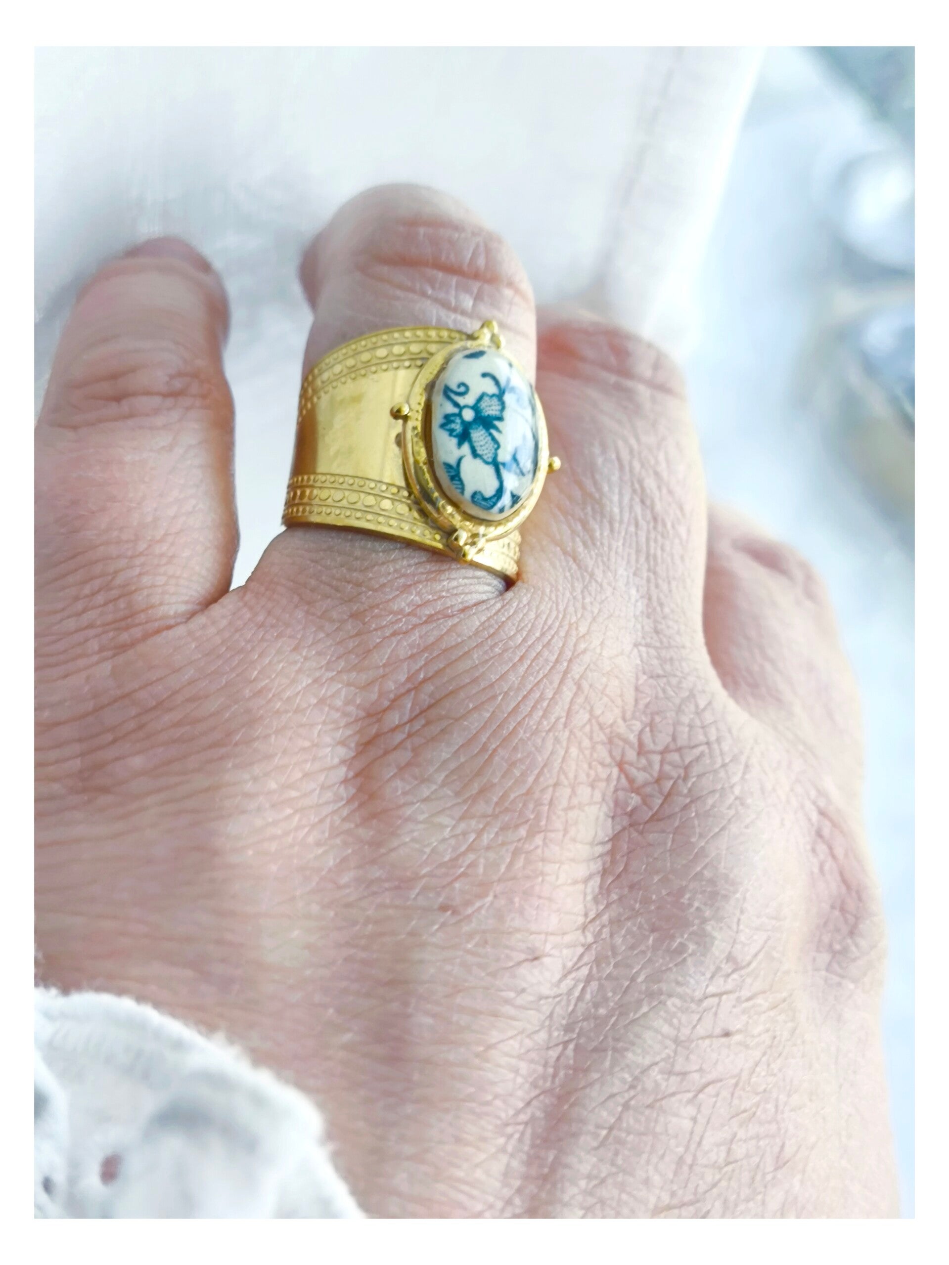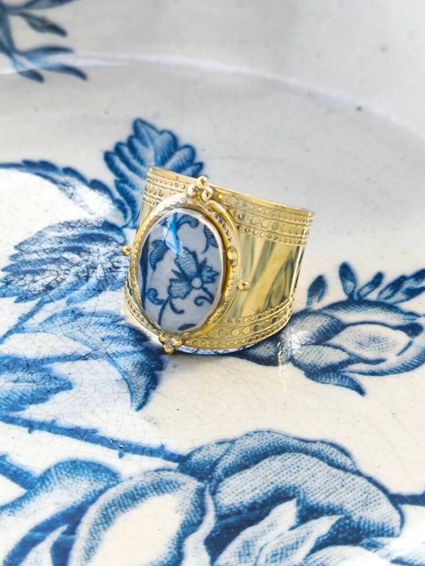 Bague Susanne – Faïence ancienne de Sarreguemines | Monture dorée à l’or fin | bijou fait-main | vaisselle recyclée