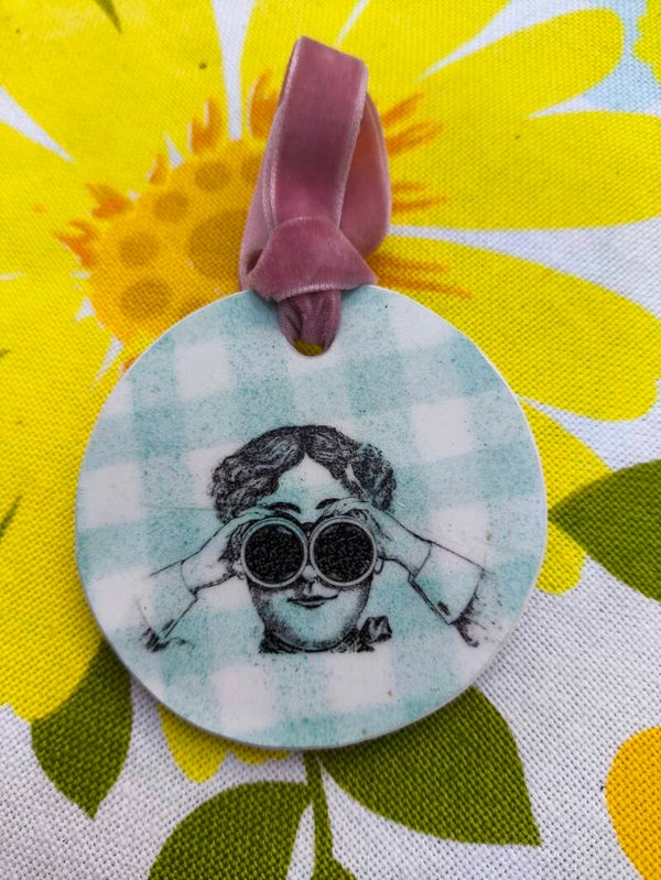Offrez à votre décoration une touche de charme vintage et de poésie avec ces médaillons uniques, confectionnés à partir de véritables assiettes en faïence Badonviller au motif vichy vert d’eau, typique des années 30. Chaque pièce est soigneusement découpée, poncée et sérigraphiée à la main dans notre atelier.