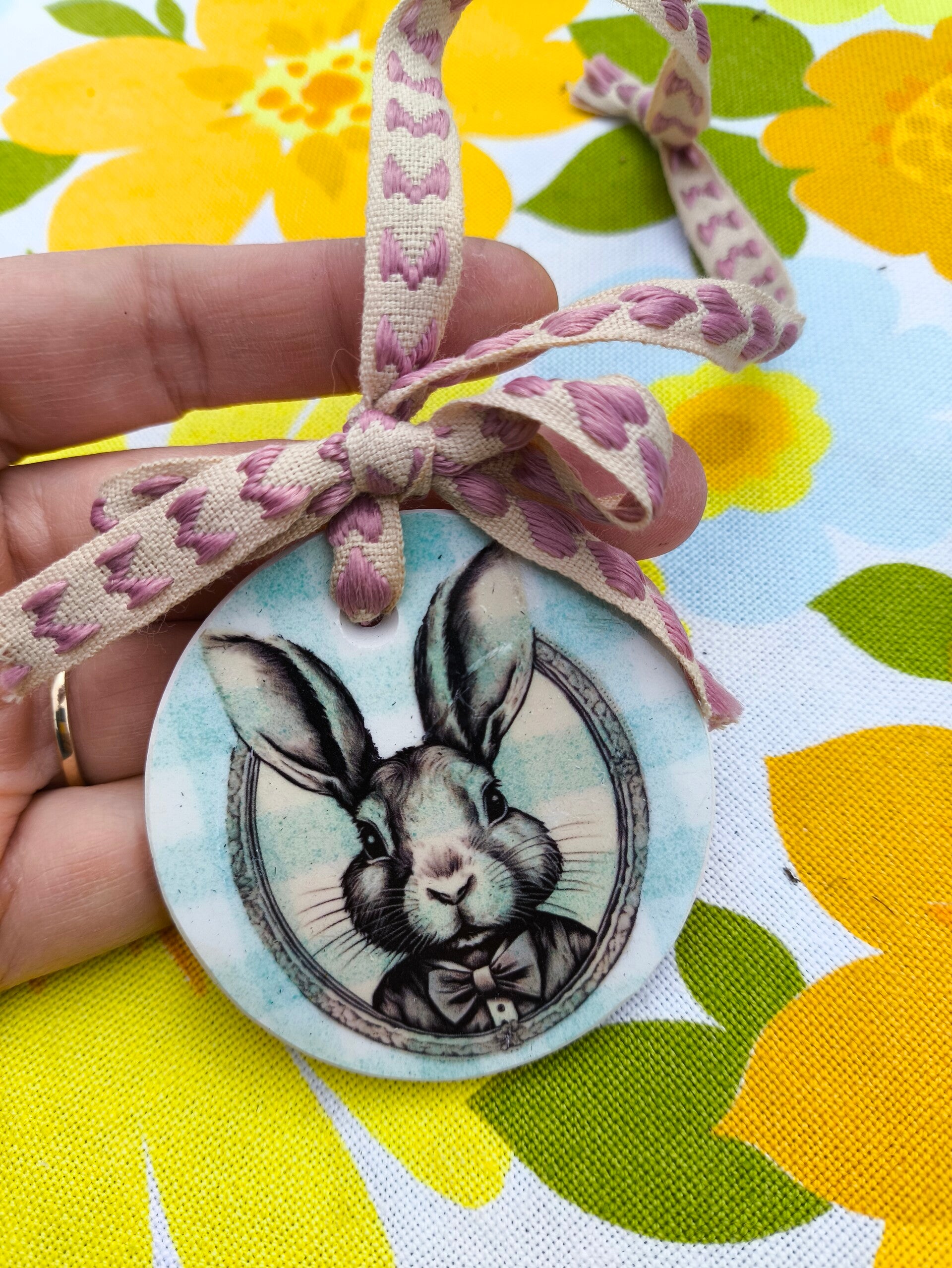 – Le lapin élégant : vêtu d’un nœud papillon et posé dans un médaillon façon portrait d’antan, il évoque un monde féerique et raffiné, quelque part entre Lewis Carroll et les cabinets de curiosités.