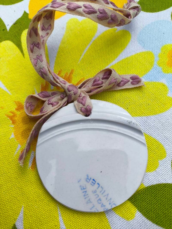 Médaillon poétique en faïence Badonviller recyclée – Sérigraphie artisanale sur motif vichy bleu