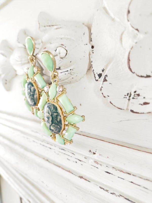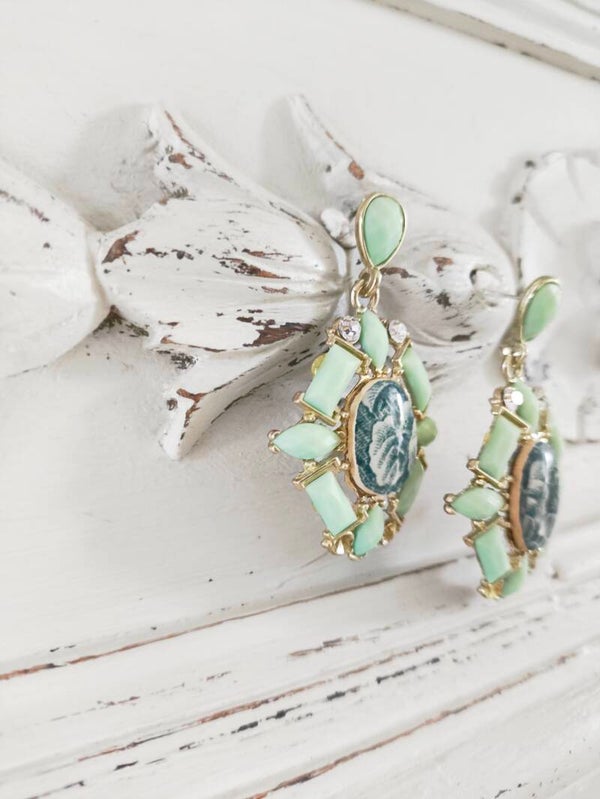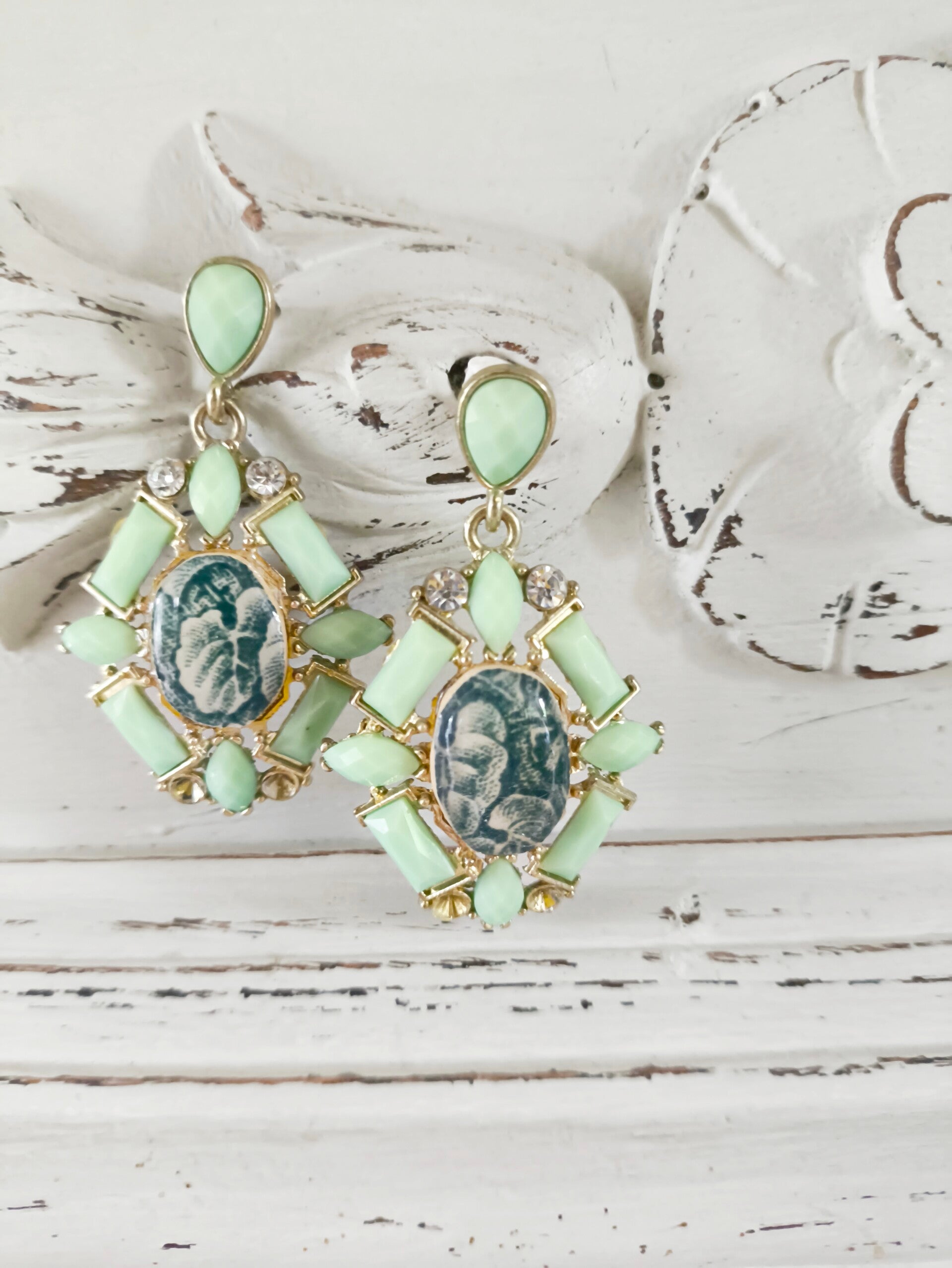Créée à partir d’un éclat de faïence ancienne de Gien et d’une paire de boucles vintage en bakélite vert d’eau et laiton doré, chaque détail de cette paire raconte une histoire, entre héritage et poésie.