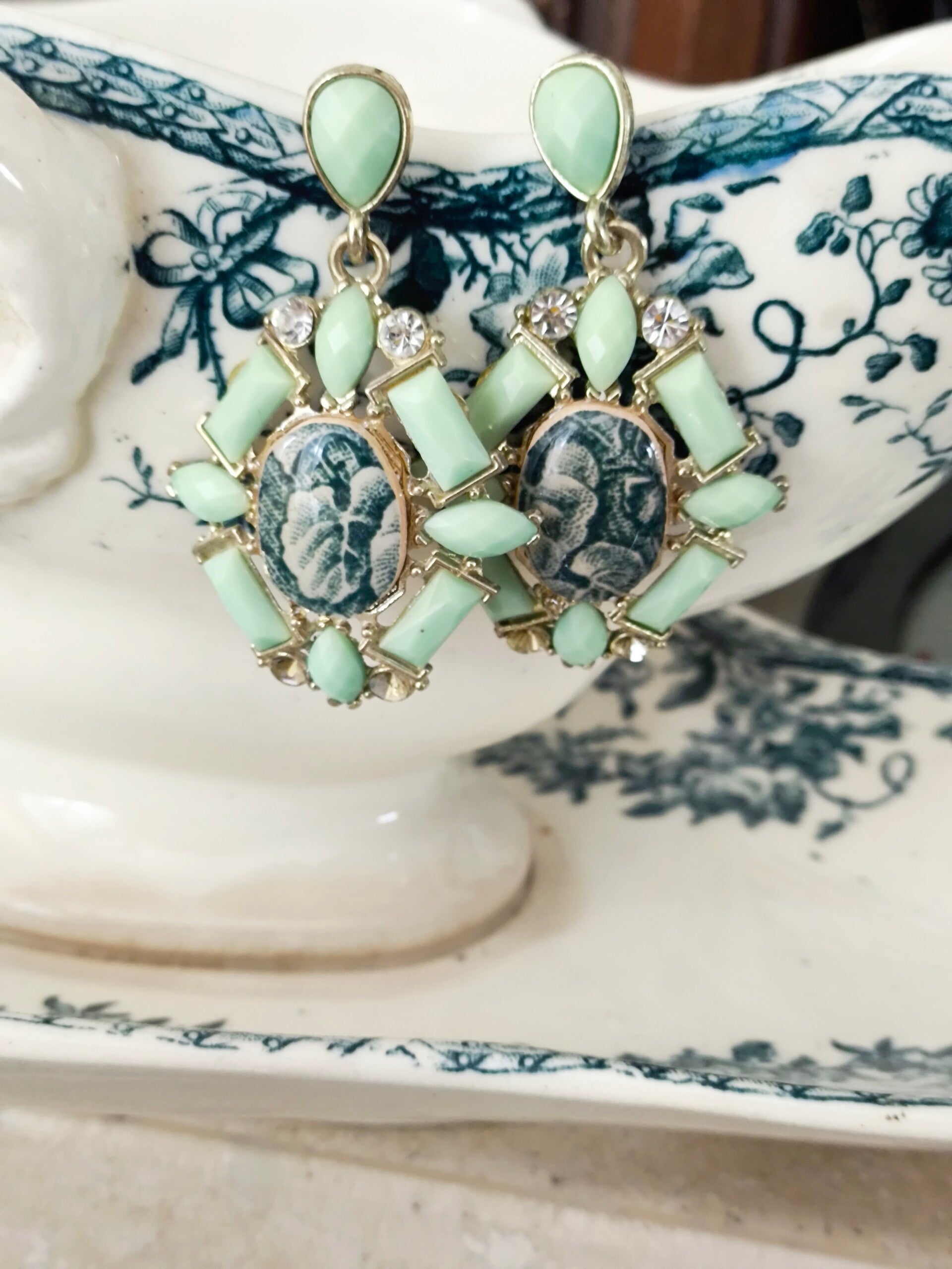 Boucles d’oreilles Zélie – faïence ancienne Gien recyclé & bakélite vert d’eau – bijou vintage